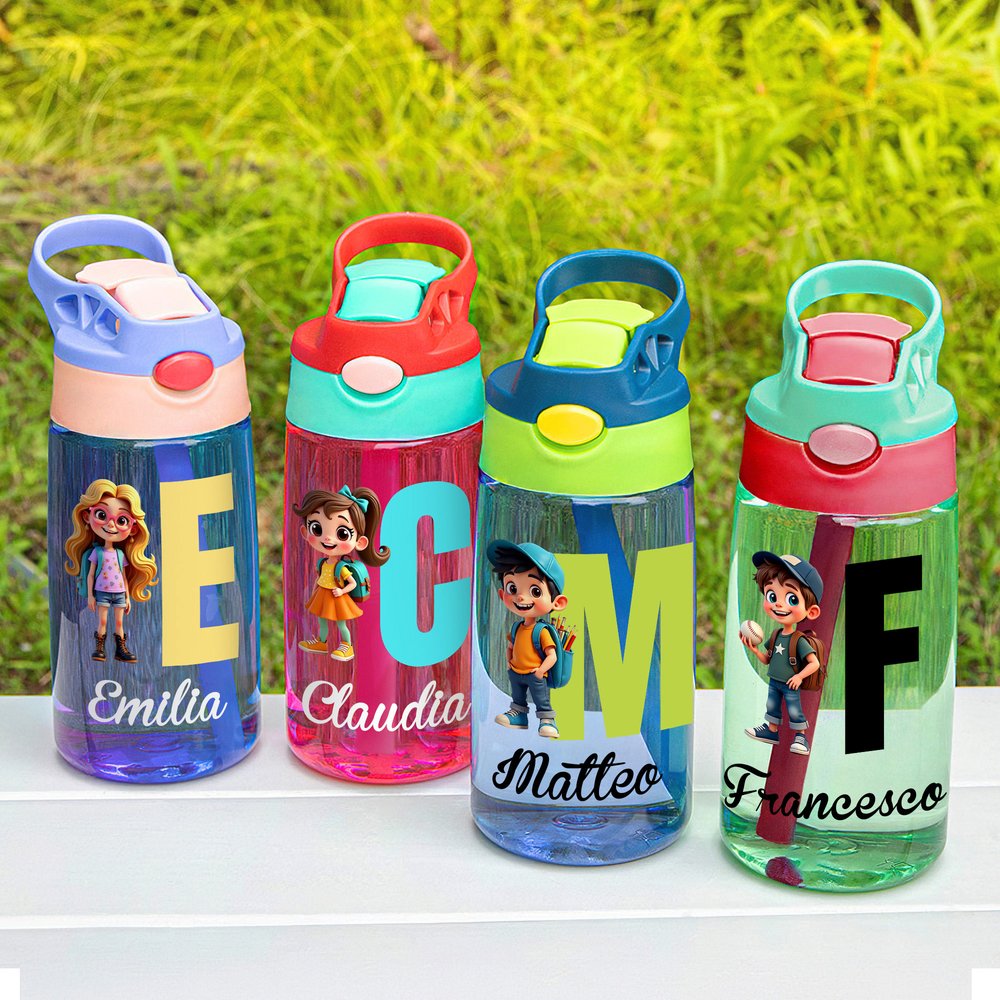 Scegli il tuo personaggio preferito in stile cartone animato, seleziona il colore dell’iniziale tra opzioni come nero, blu, marrone, oro e altro, personalizza l’iniziale e inserisci il nome che preferisci. Personalizza una borraccia unica, perfetta per i gusti del tuo bambino.
