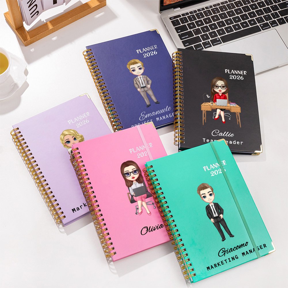 La copertina di questo planner porta colore e creatività in ufficio: personaggi in stile cartone animato e scene di lavoro vivaci rendono unico ogni dettaglio. Con il tuo nome e titolo professionale personalizzati, un semplice strumento d’ufficio diventa subito più caldo e personale, unendo ordine e raffinatezza.