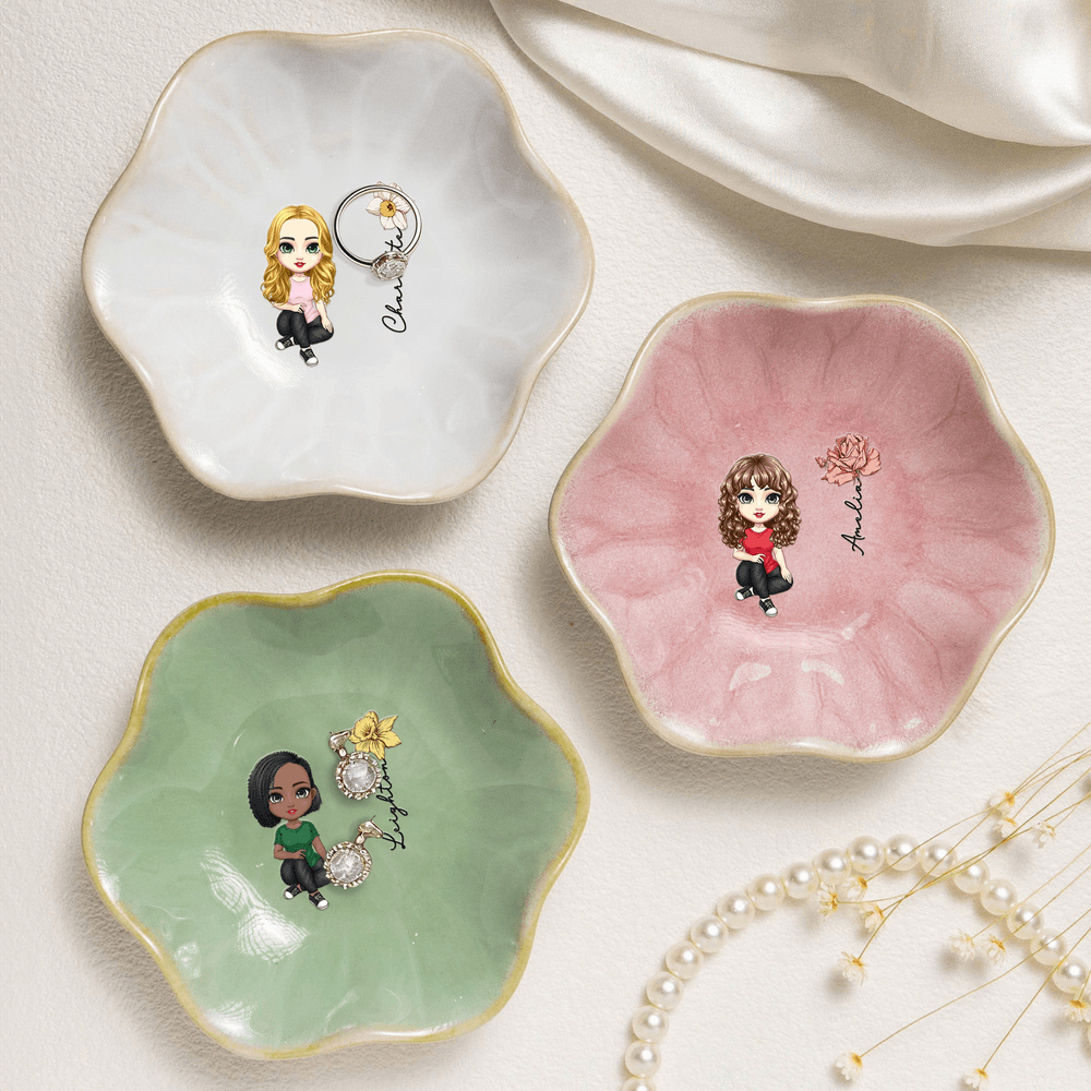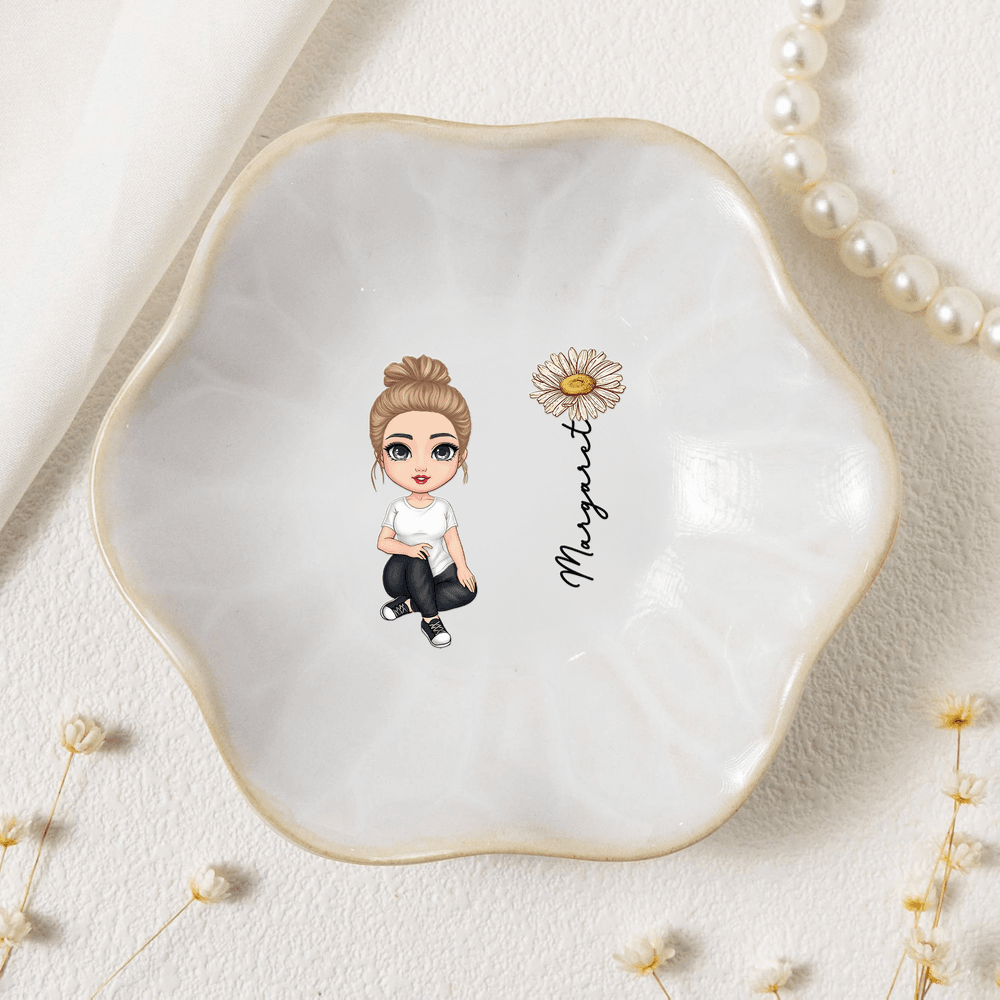 Questo vassoio portagioie è caratterizzato da un affascinante personaggio dei cartoni animati e da una morbida finitura smaltata in toni caldi. Può essere completamente personalizzato con un fiore di nascita, il vostro nome e un simpatico personaggio dei cartoni animati, unendo un design giocoso a un sentimento sincero per creare un ricordo unico che riflette personalità e calore.