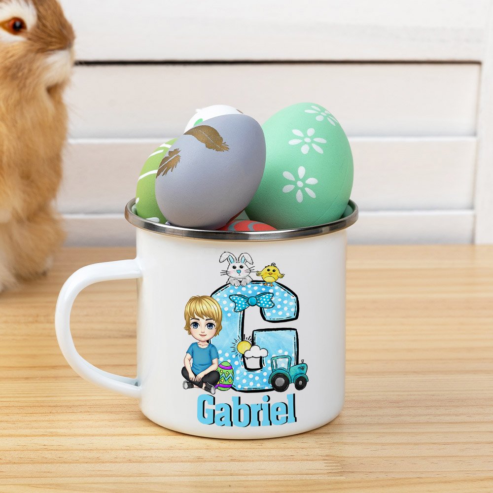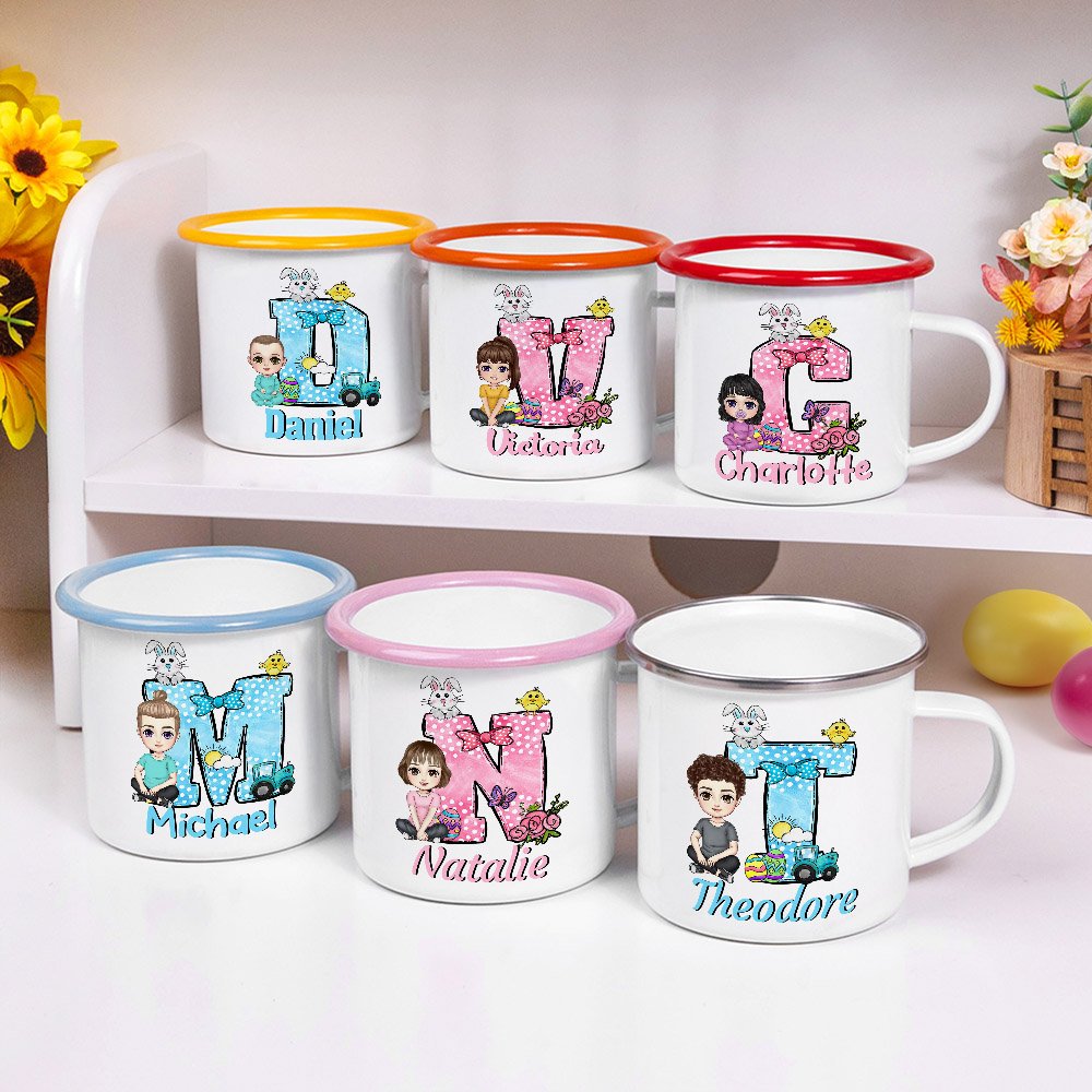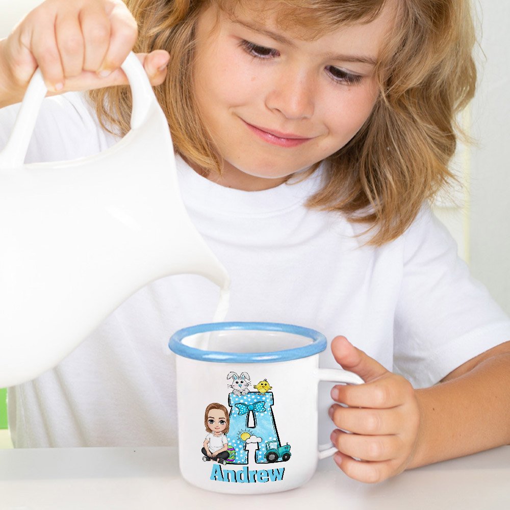 La tazza è progettata con colori vivaci e un'immagine da cartone animato. Ogni tazza è stampata con una simpatica immagine di bambino e decorata con lettere e nomi personalizzabili, che rendono ogni tazza unica. Le lettere sono decorate con coniglietti colorati, pulcini, fiocchi, uova e altri motivi, per dare alle persone una sensazione di calore e vivacità.