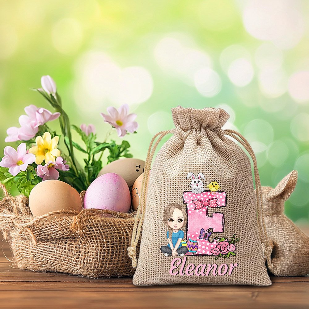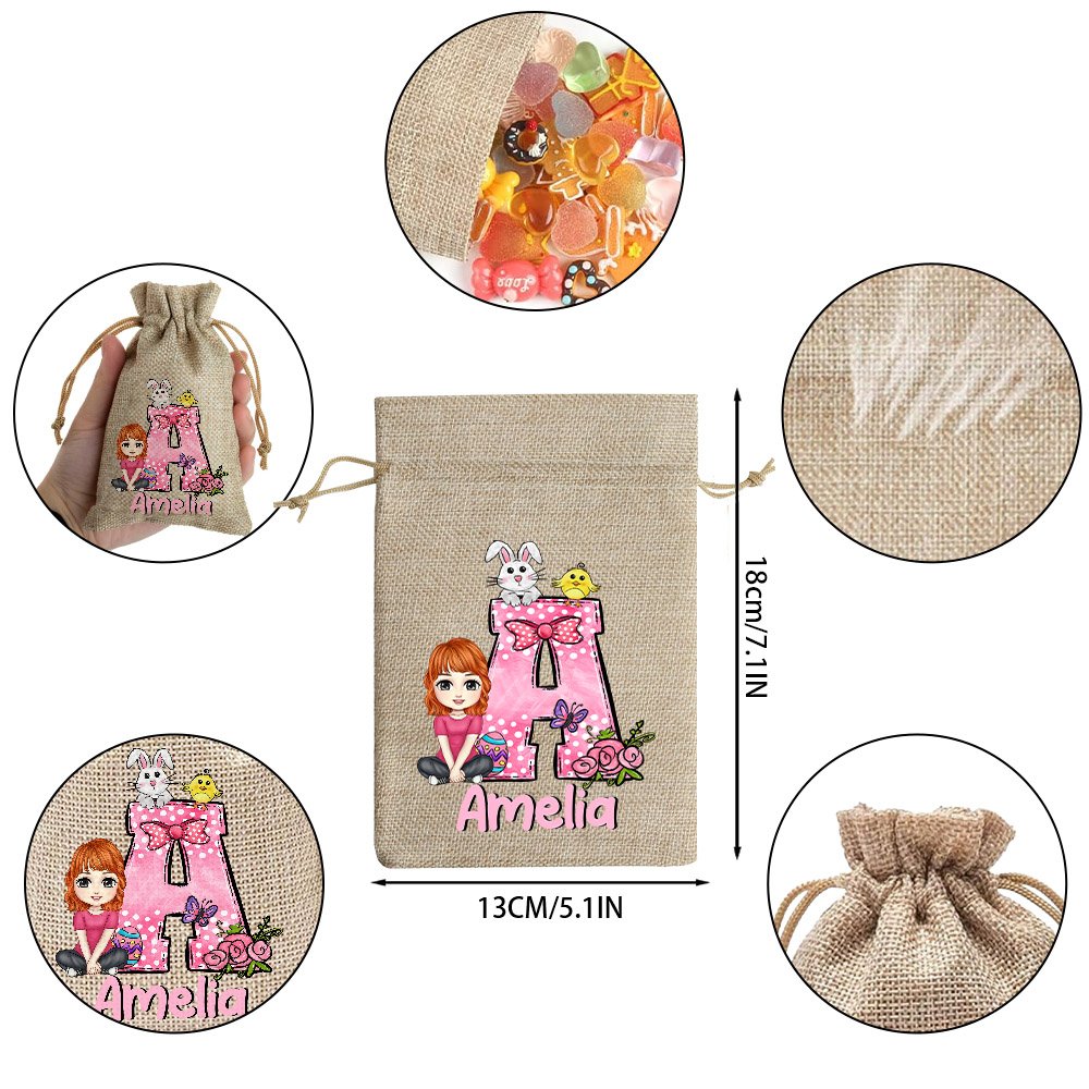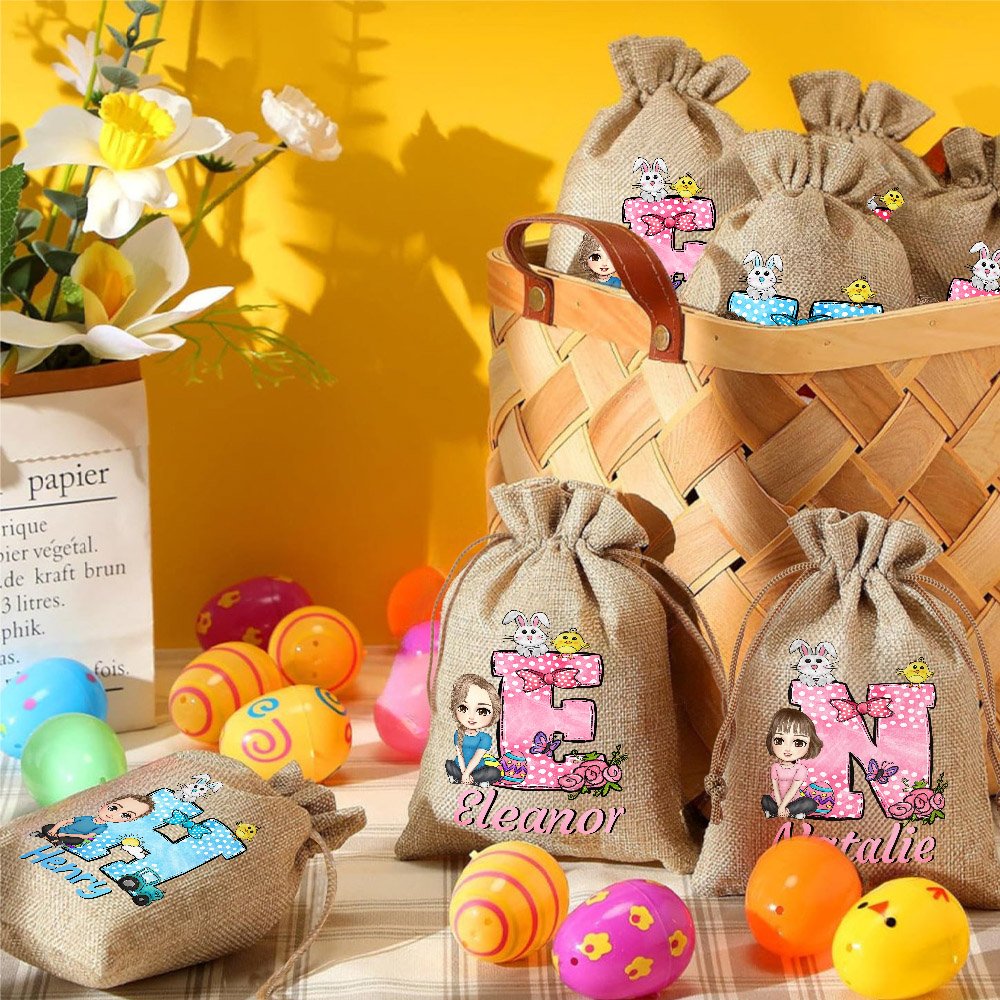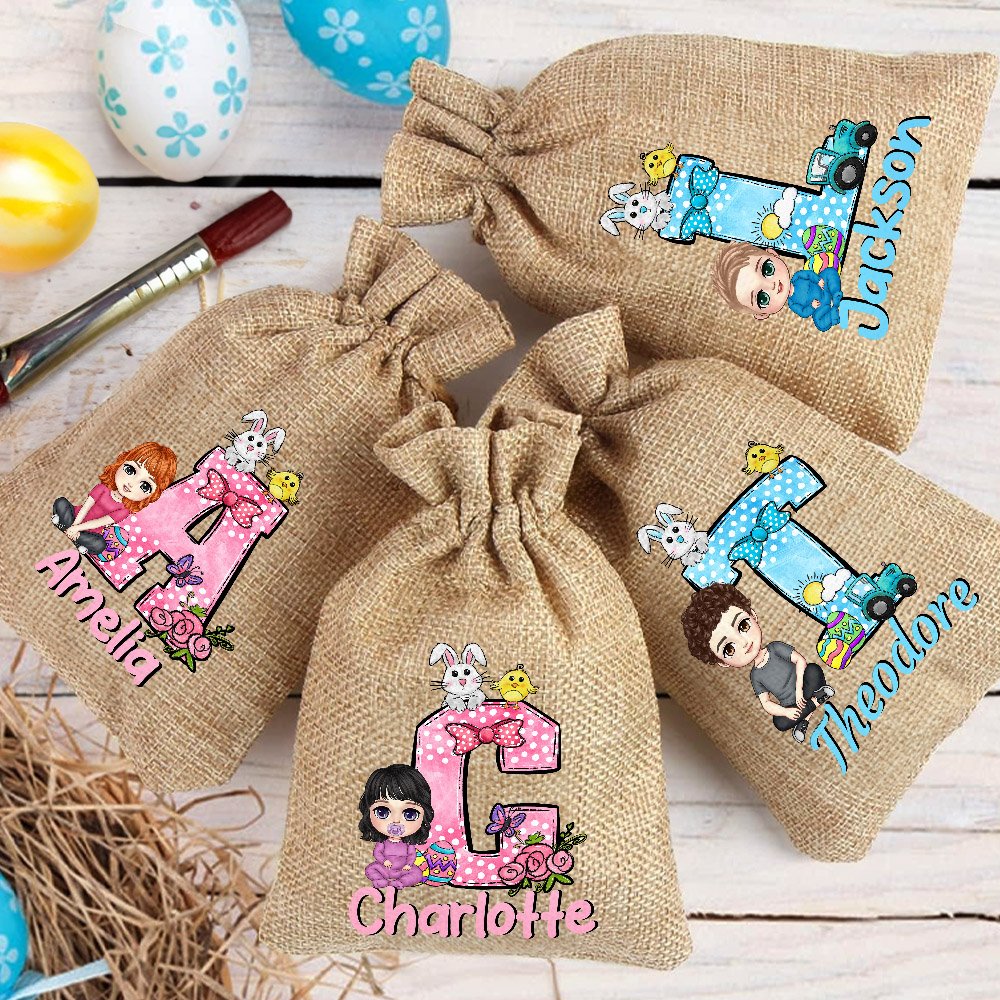 Questa borsa è progettata con colori vivaci e personaggi dei cartoni animati. Ogni borsa è stampata con la simpatica immagine di un bambino e decorata con un'iniziale e un nome personalizzabile, rendendo ogni borsa unica. L'iniziale è decorata con motivi di coniglietti, pulcini, fiocchi e uova, che rendono la borsa estremamente attraente.