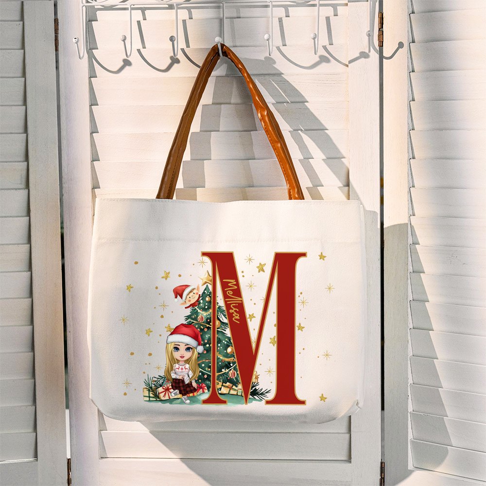 Questa festosa tote bag è caratterizzata da un giocoso personaggio dei cartoni animati e da un albero di Natale splendidamente disegnato, arricchito da lettere rosse a tema natalizio. È possibile personalizzarla con un nome o un'iniziale, rendendola un regalo unico che sarà unico come la persona che lo riceverà.