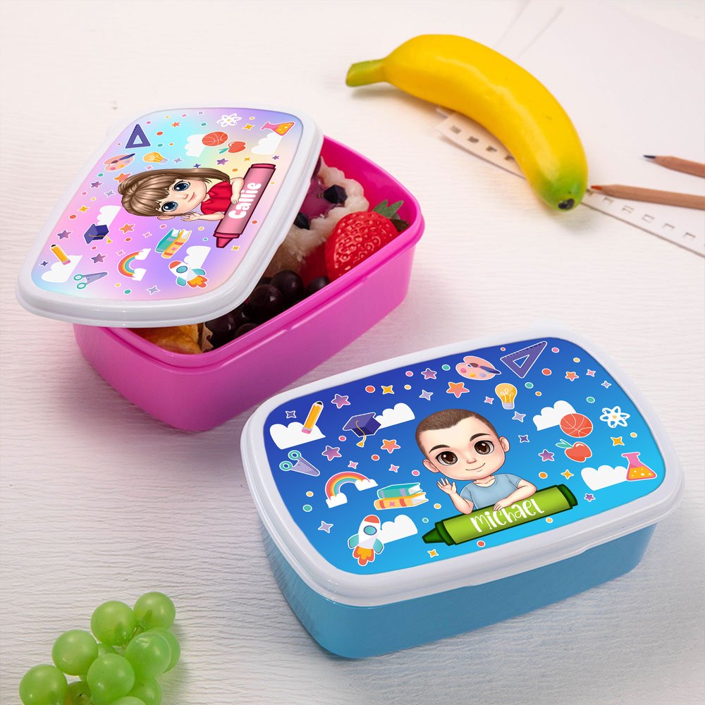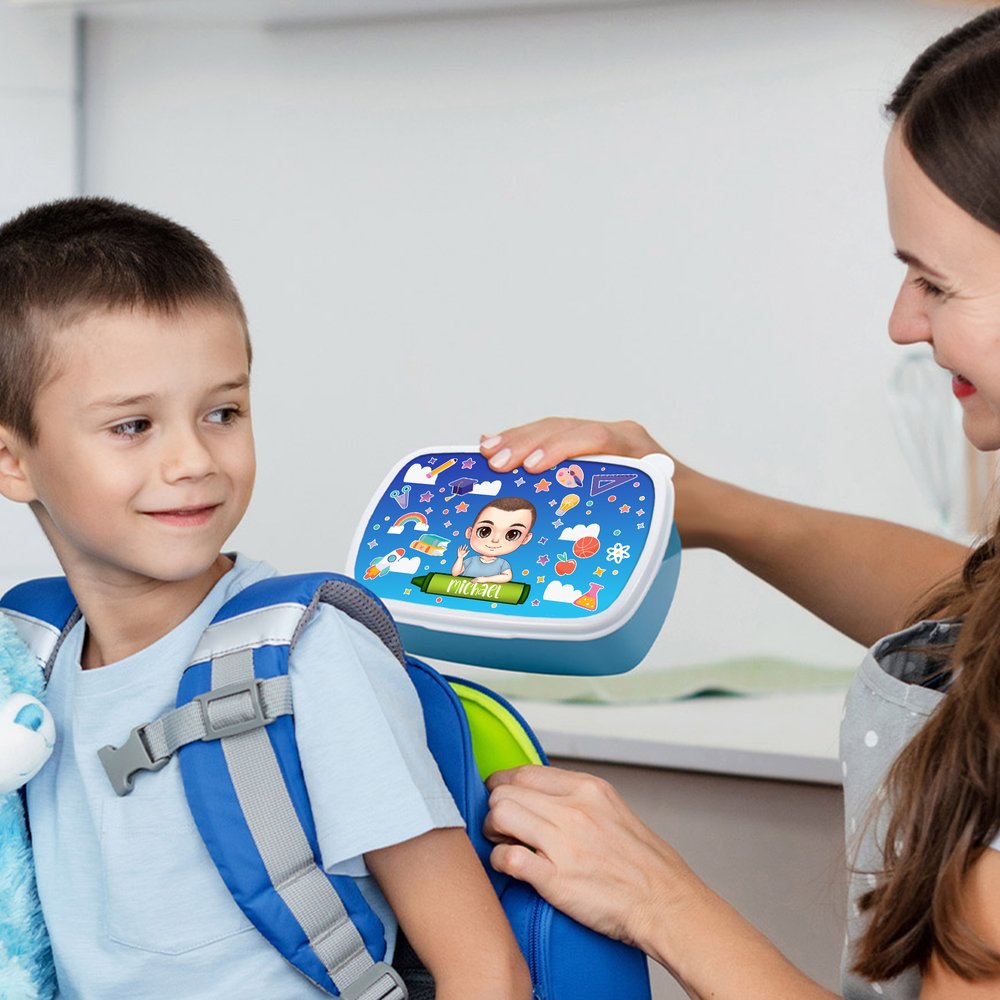 Questo portamerenda presenta simpatici personaggi in stile cartone animato e include elementi amati dai bambini, come arcobaleni e stelle, per stimolare immaginazione e creatività. I colori vivaci e i disegni giocosi catturano l’attenzione e rendono il momento del pasto più divertente. Inoltre, ogni portamerenda può essere personalizzato con il nome del bambino.