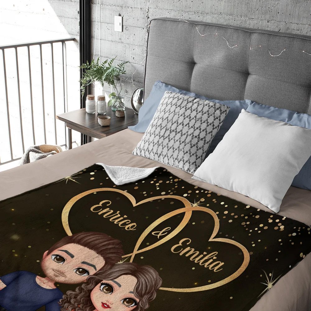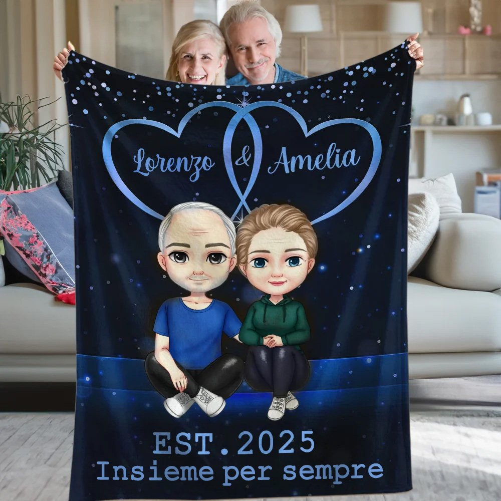 Questa tenera coperta personalizzata raffigura una coppia in stile cartone animato, impreziosita da un doppio cuore su cui è possibile aggiungere i nomi dei partner. Sotto i personaggi, puoi inserire una data speciale e una frase personalizzata. Un regalo unico che racchiude amore, calore e ricordi preziosi.