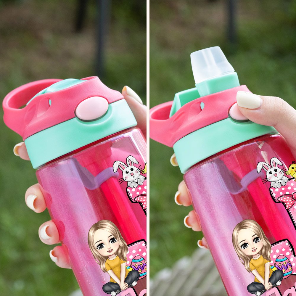Con colori vivaci e personaggi dei cartoni animati come fulcro del design, questa borraccia è stampata con simpatiche immagini di bambini e decorata con lettere e nomi personalizzabili, rendendo ogni bottiglia unica. Le lettere sono decorate con coniglietti colorati, pulcini, fiocchi e uova, rendendo la bottiglia molto attraente.