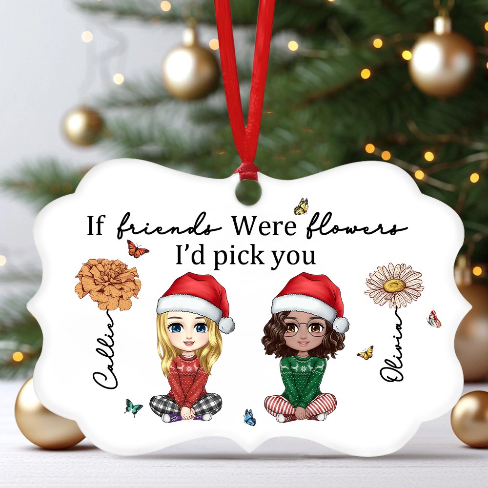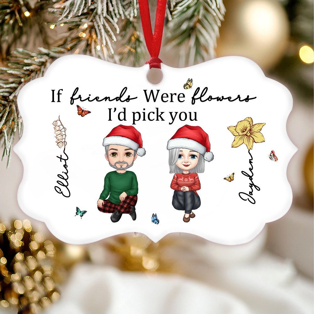 Questo ornamento ha una forma unica. L'ornamento è stampato con due personaggi dei cartoni animati ed elementi floreali di compleanno, che aggiungono infinita creatività e divertimento alla decorazione natalizia. L'ornamento è anche stampato con il testo fisso "Se gli amici fossero fiori, sceglierei te", che è interessante. Inoltre, il nome può essere personalizzato sull'ornamento per renderlo più speciale.