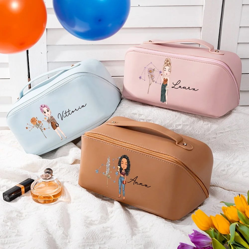 Questa trousse per il trucco personalizzata unisce il fascino di un personaggio in stile cartone animato, lo zodiaco e il fiore del mese di nascita. Puoi aggiungere anche il tuo nome, per renderla ancora più speciale e significativa. Un accessorio non solo bello, ma anche ricco di valore simbolico.