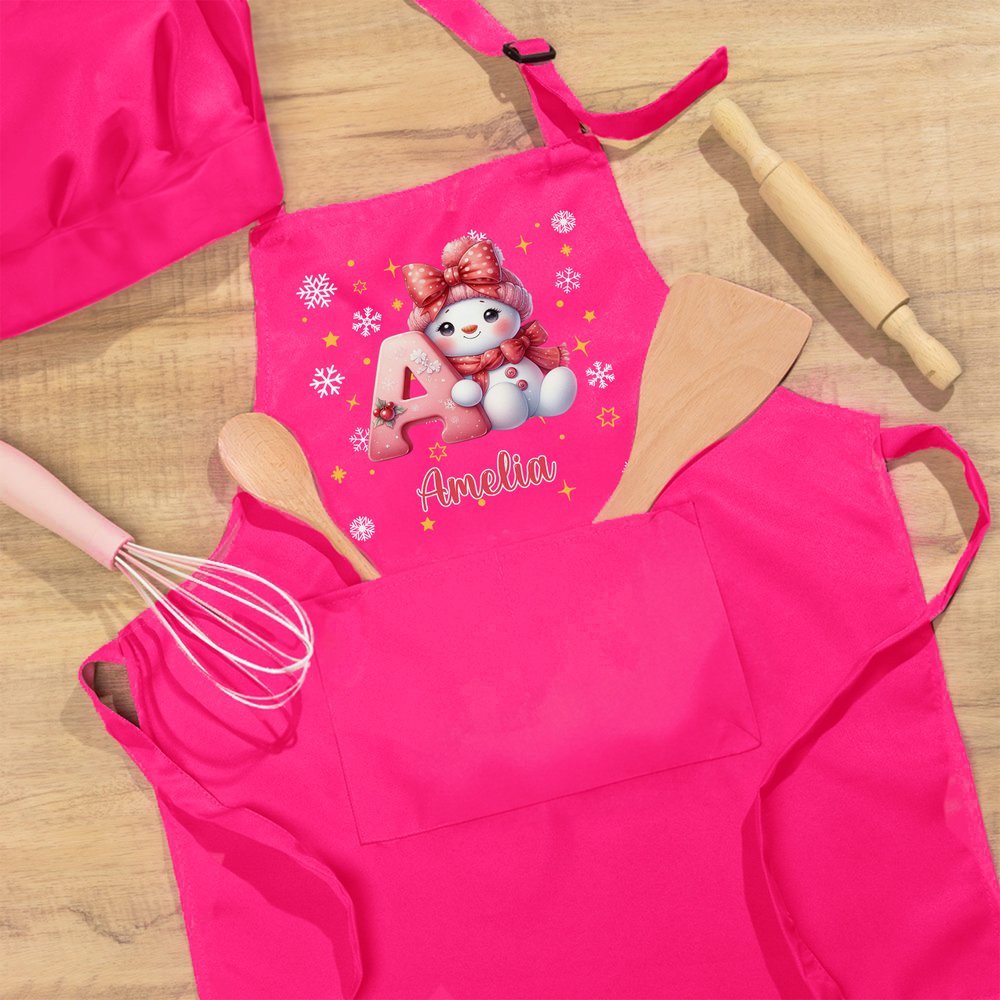Questo disegno, incentrato su un pupazzo di neve natalizio e su elementi di lettering festosi, presenta iniziali e nomi per bambini personalizzabili. Il suo stile generale trabocca di allegria natalizia e capriccio infantile. La morbida e adorabile silhouette del pupazzo di neve è vibrante e vivace e diffonde la gioia del Natale. Quando i bambini indossano questo grembiule, si trasformano immediatamente in piccoli chef di Natale, accendendo il loro entusiasmo per le attività natalizie.