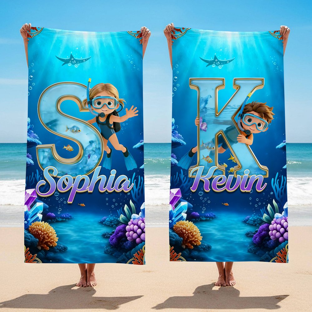 Questo telo da mare è caratterizzato da un personaggio di un bambino e una bambina che si tuffano e può essere personalizzato con l'iniziale e il nome del bambino. È abbinato a una scena subacquea di colore blu intenso con elementi marini come coralli, pesciolini e bolle, creando un'atmosfera meravigliosa che cattura perfettamente il desiderio dei bambini di esplorare l'oceano.