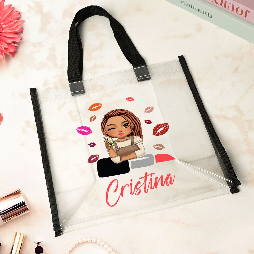 Questa borsa è decorata con un'immagine di una ragazza alla moda in stile cartone animato, circondata da motivi di rossetto, che aggiungono un tocco di divertimento e vitalità. Puoi anche personalizzarla con il tuo nome, rendendola ancora più speciale e perfetta per esprimere il tuo stile unico.