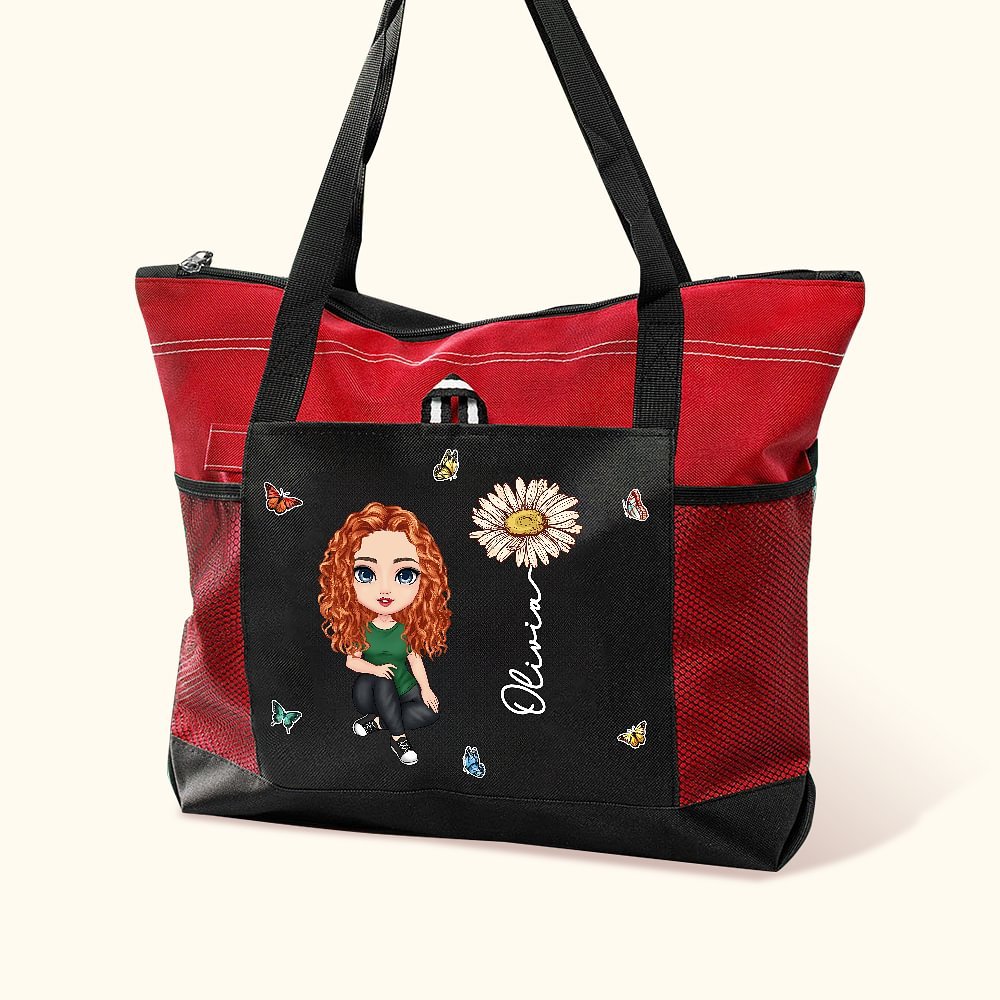 Puoi personalizzare questa borsa tote con un personaggio di donna o ragazza in stile cartone animato circondato da farfalle, insieme a fiori di nascita e nomi, per un aspetto unico e personale .