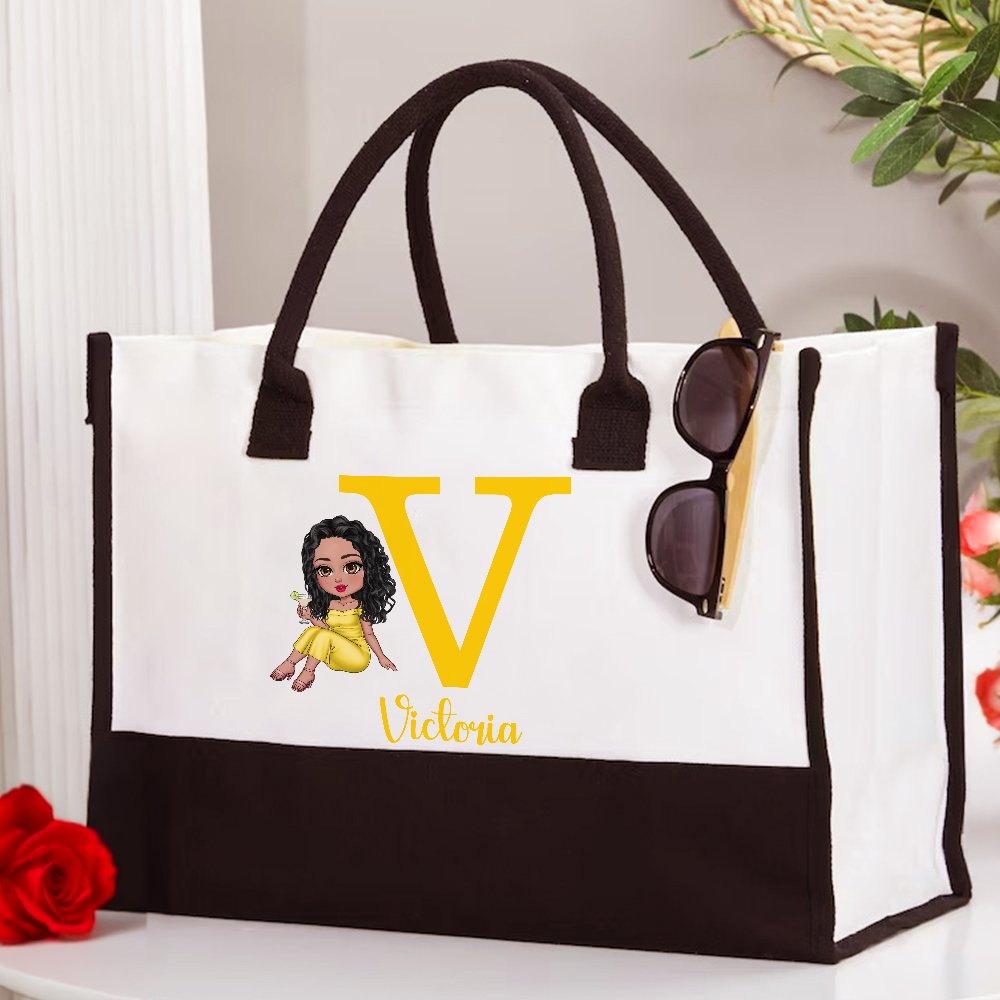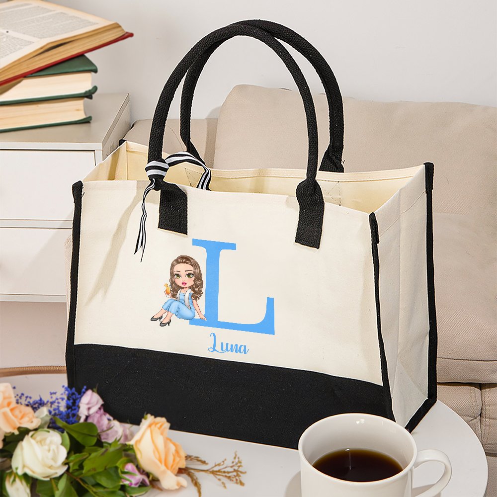 Le nostre borse sono disponibili in una semplice ed elegante combinazione di colori bianco e nero, personalizzate con l'immagine di un cartone animato di una ragazza, e possono anche essere personalizzate con il nome e le iniziali della persona, rendendole un regalo unico e significativo, perfetto per mostrare apprezzamento per il loro viaggio verso la laurea.