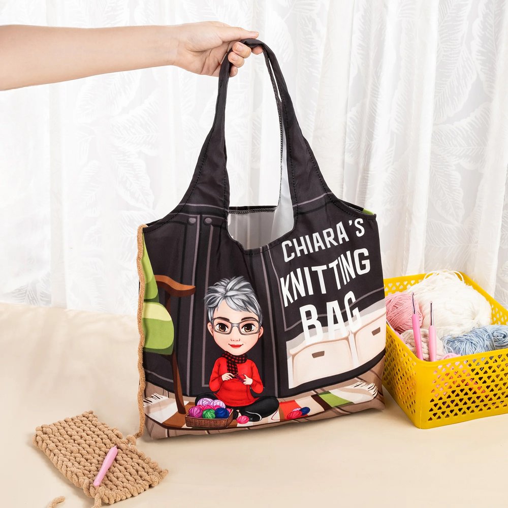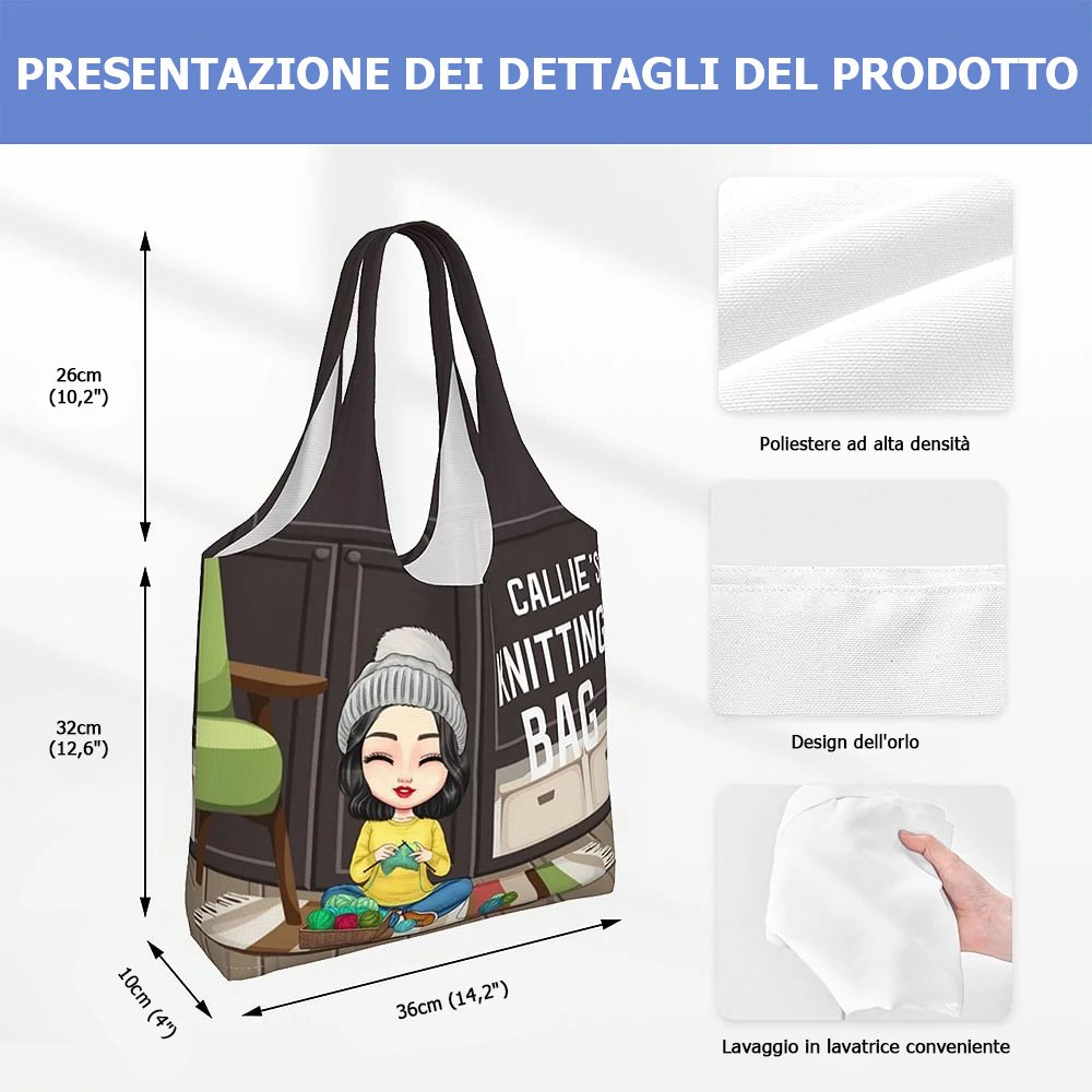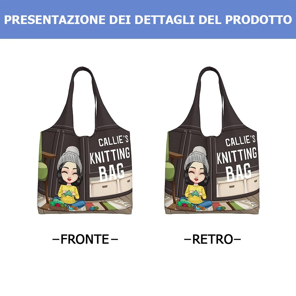 Questa borsa è pensata per te che ami la maglia. Raffigura una donna in stile cartone animato che lavora a maglia, abbinata alla scritta "Knitting Bag", perfetta per le appassionate. Puoi personalizzare il nome e persino l'aspetto del personaggio, creando una borsa unica che rispecchia la tua personalità.