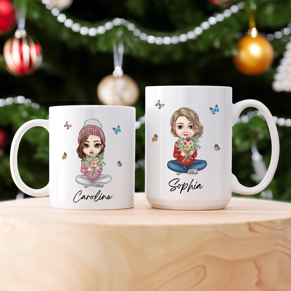 Personalizzato Cartoon mamma nonna che tiene bouquet di fiori nascita 11 oz 15 oz tazza di ceramica con nome compleanno regalo di Natale per le donne