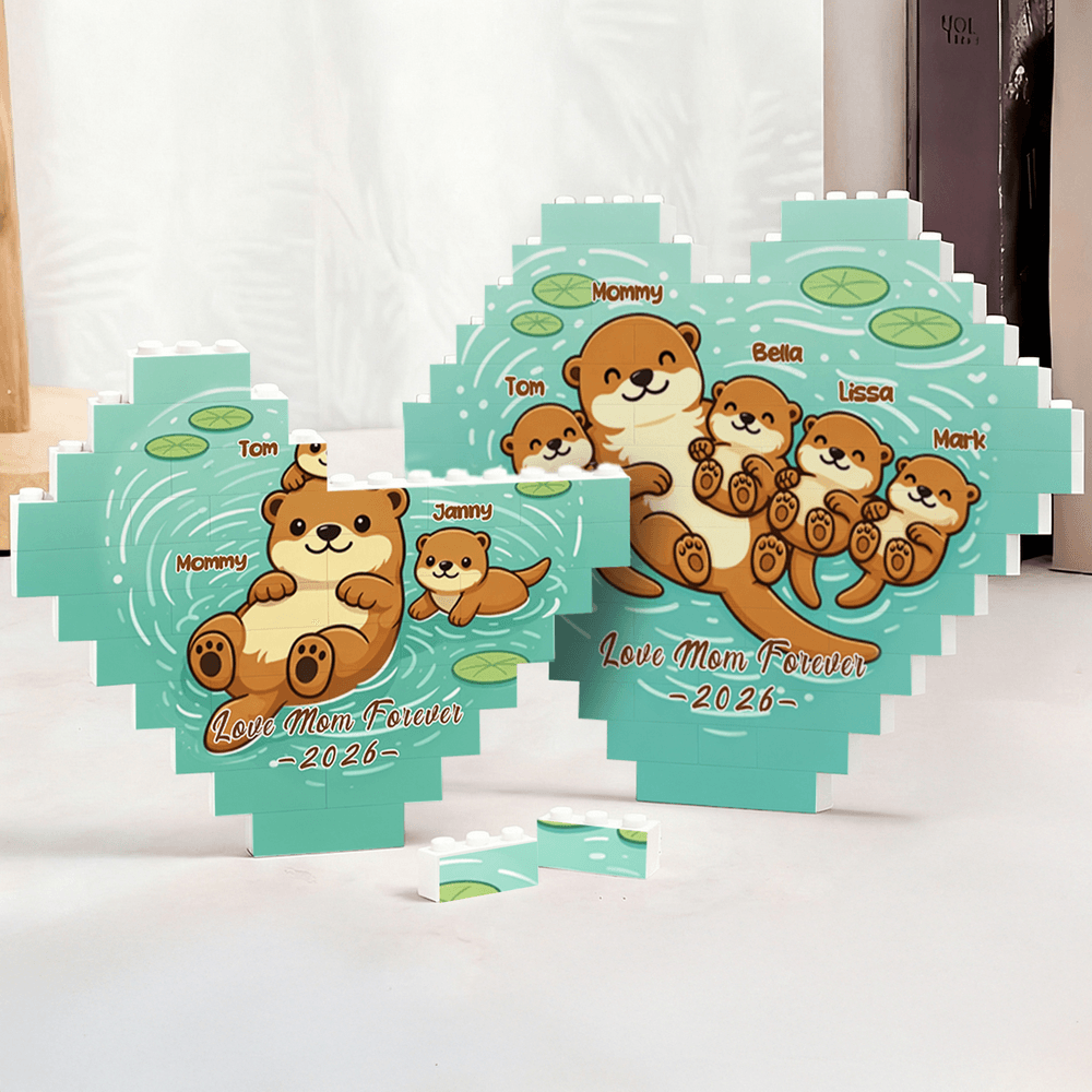 Personalizzato Cartoon Otter Family Heart Building Brick Puzzles con 2-6 nomi testo e anno Regalo per la festa della mamma Donna