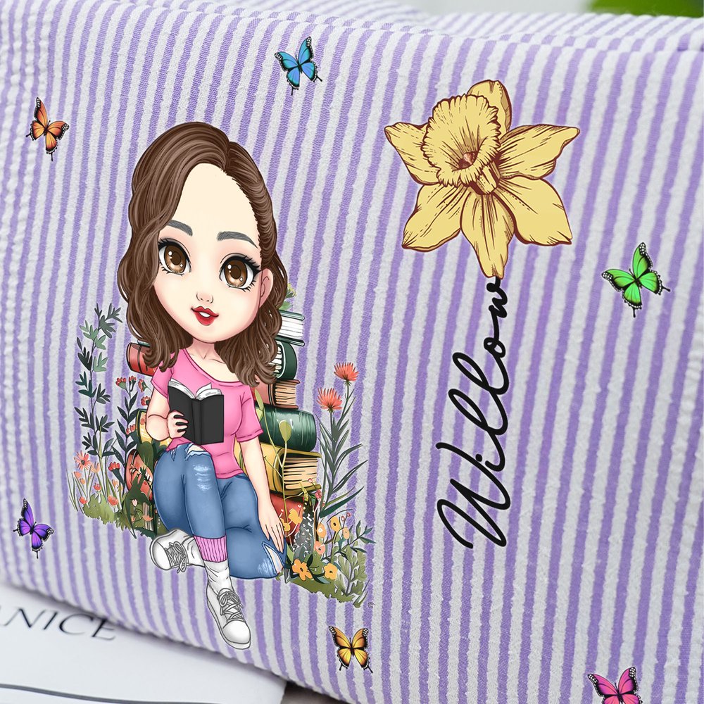 Ogni borsa presenta un personaggio dei cartoni animati personalizzato che legge libri, circondato da farfalle e da un fiore di nascita. I sacchetti sono decorati con composizioni floreali e verde, creando un'atmosfera stravagante e letteraria. È possibile personalizzare un personaggio dei cartoni animati, selezionare un fiore di nascita e aggiungere un nome, trasformando la borsa in un ricordo unico che unisce fascino letterario e identità personale.