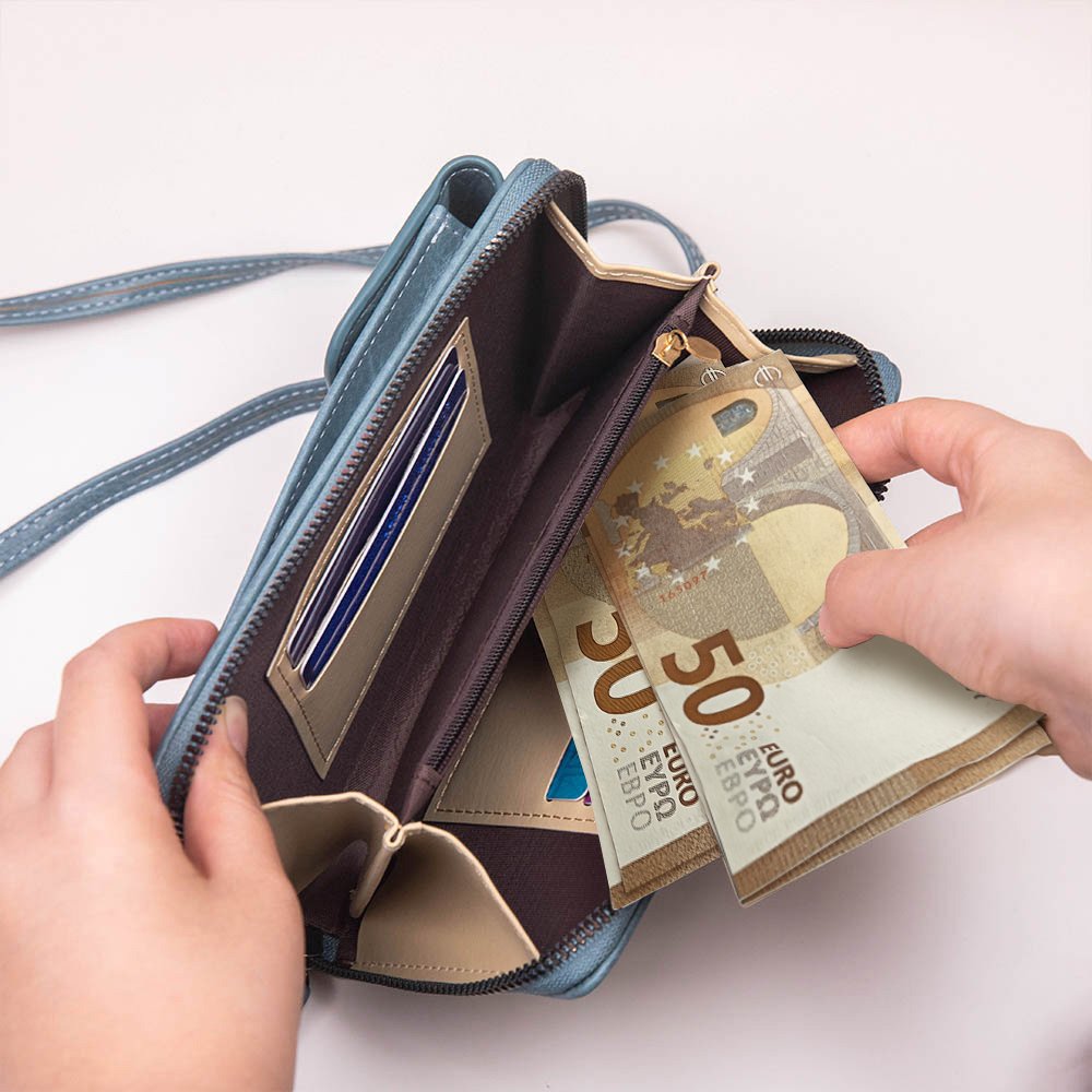 Progettato all'insegna della praticità, presenta un'accurata disposizione a due scomparti. La tasca anteriore è perfettamente dimensionata per la maggior parte degli smartphone, mentre la tasca posteriore è abbastanza spaziosa per monete, carte e banconote. La comoda tracolla consente un utilizzo a mani libere e può essere indossata come un'elegante borsa a tracolla, esaltando il vostro stile.
