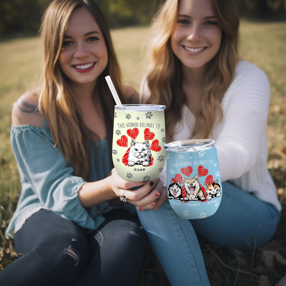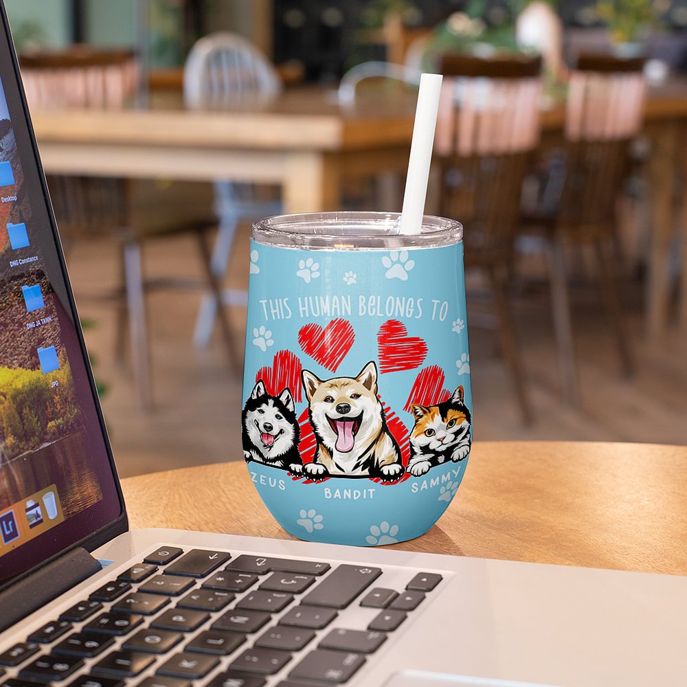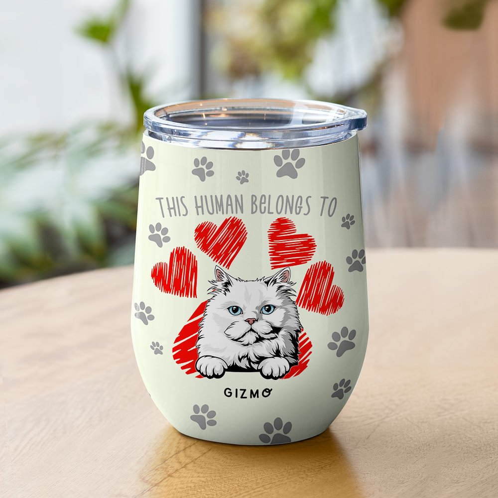 Il tumbler riporta la frase "This Human Belongs To" (Questo umano appartiene a), accompagnata da un'affascinante immagine di un animale domestico. L'accattivante disegno a zampa sulla parte anteriore del bicchiere lo rende un regalo delizioso per gli amanti degli animali domestici con senso dell'umorismo.