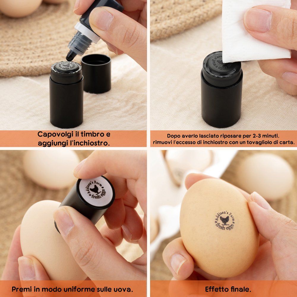 Questo timbro per uova, unico nel suo genere, presenta la sagoma di una gallina che si adatta a qualsiasi uovo o cartone. È possibile aggiungere un testo, come un cognome o un messaggio speciale, per rendere ogni uovo un ricordo unico che non solo valorizza l'esposizione dell'uovo, ma riflette anche il vostro orgoglio di agricoltori o allevatori.