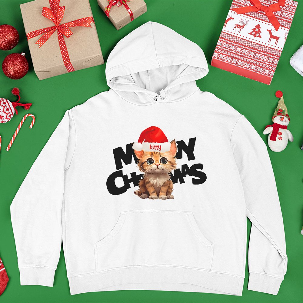Questa felpa con cappuccio presenta una grafica giocosa e colorata di un simpatico animale domestico che indossa un cappello da Babbo Natale con la scritta "Meowy Christmas", aggiungendo un ulteriore tocco di spirito natalizio. Questo design accattivante porterà sicuramente sorrisi e complimenti ovunque lo si indossi.