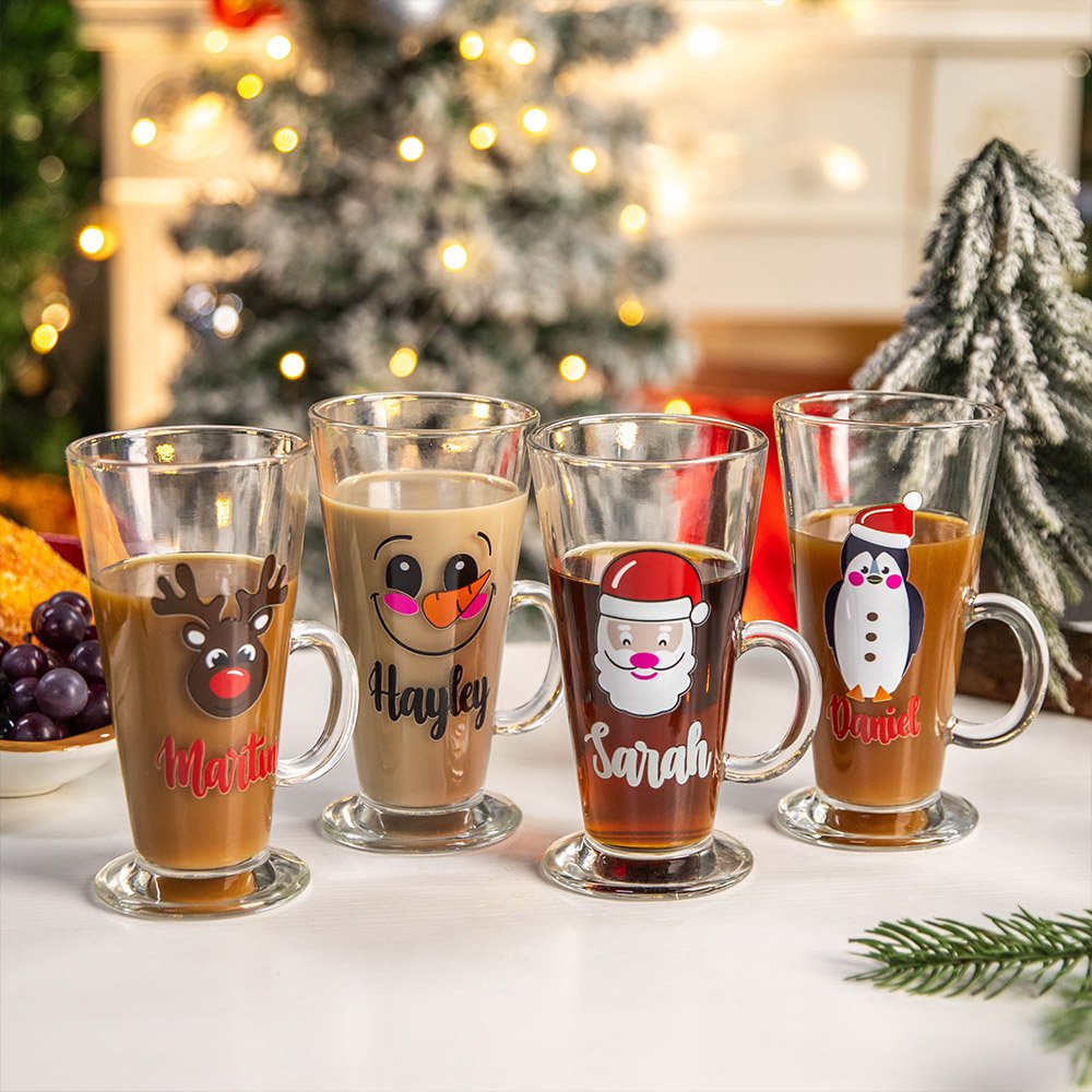 Celebrate le festività natalizie con questo incantevole bicchiere personalizzato con i deliziosi stili natalizi di un pupazzo di neve, Babbo Natale, un pinguino e un cervo. Personalizzatelo con un nome per creare un regalo unico e una decorazione per le feste perfetta per la famiglia e gli amici.