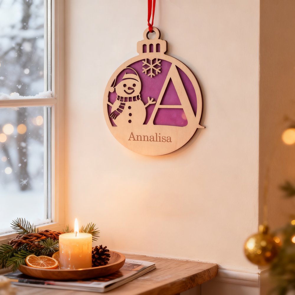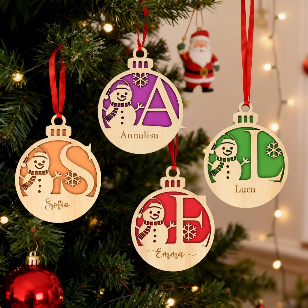 Il design presenta un pupazzo di neve e fiocchi di neve come elementi principali, personalizzabile con il tuo nome e le tue iniziali, disponibile in quattro colori. Lo stile complessivo crea un’atmosfera festosa rendendolo una decorazione perfetta per il periodo natalizio. Il design personalizzato permette di creare un’atmosfera natalizia unica.