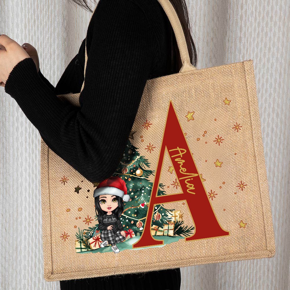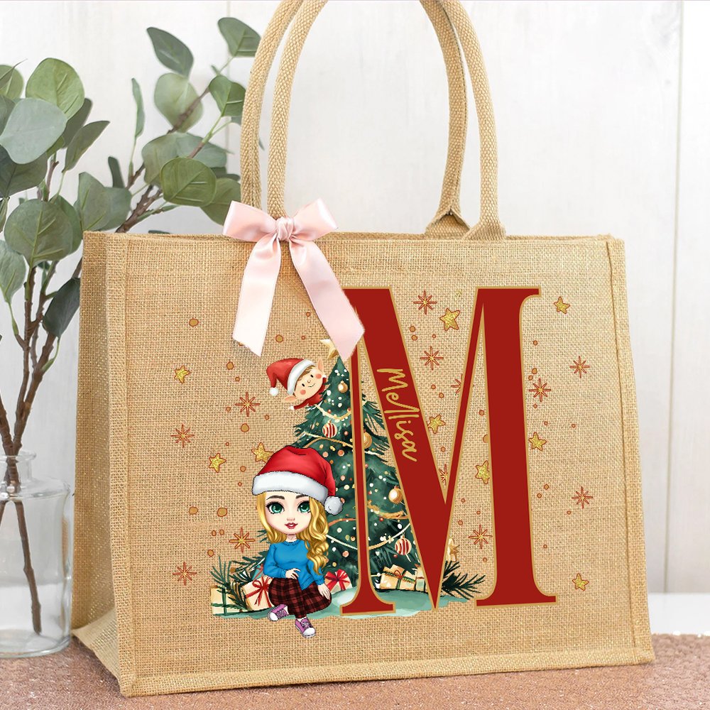 Albero di Natale personalizzato Piccolo elfo personaggio dei cartoni animati Borsa in iuta con iniziali e nome Regalo di Natale per la famiglia e i bambini