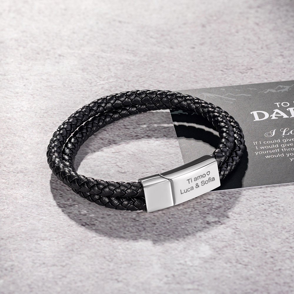 Questo bracciale classico in pelle intrecciata non è solo un semplice accessorio, ma un regalo unico e premuroso. Il testo inciso personalizzato aggiunge un tocco di stile e personalità, rendendolo perfetto per completare qualsiasi abbigliamento.