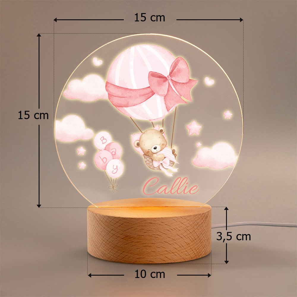 Questa luce notturna raffigura un tenero orsacchiotto seduto in una mongolfiera, circondato da soffici nuvole e stelle scintillanti, creando un’atmosfera sognante e dolcissima. Disponibile in due varianti di colore, blu e rosa, può essere personalizzata con il nome del bambino, rendendola un dono unico e speciale.