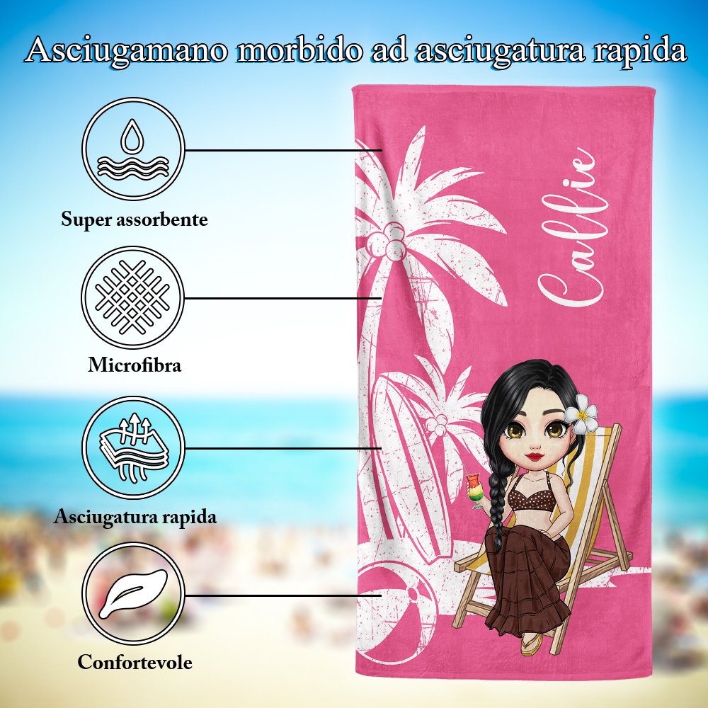 Questo asciugamano da spiaggia presenta un personaggio in stile cartone animato abbinato a silhouette classiche da vacanza come palme, tavole da surf e palloni da spiaggia, creando un'esperienza visiva allegra e rilassante. Puoi personalizzare il personaggio in base alla tua immagine, trasmettendo una forte atmosfera da vacanza. Puoi anche aggiungere il tuo nome, rendendolo un ricordo unico.