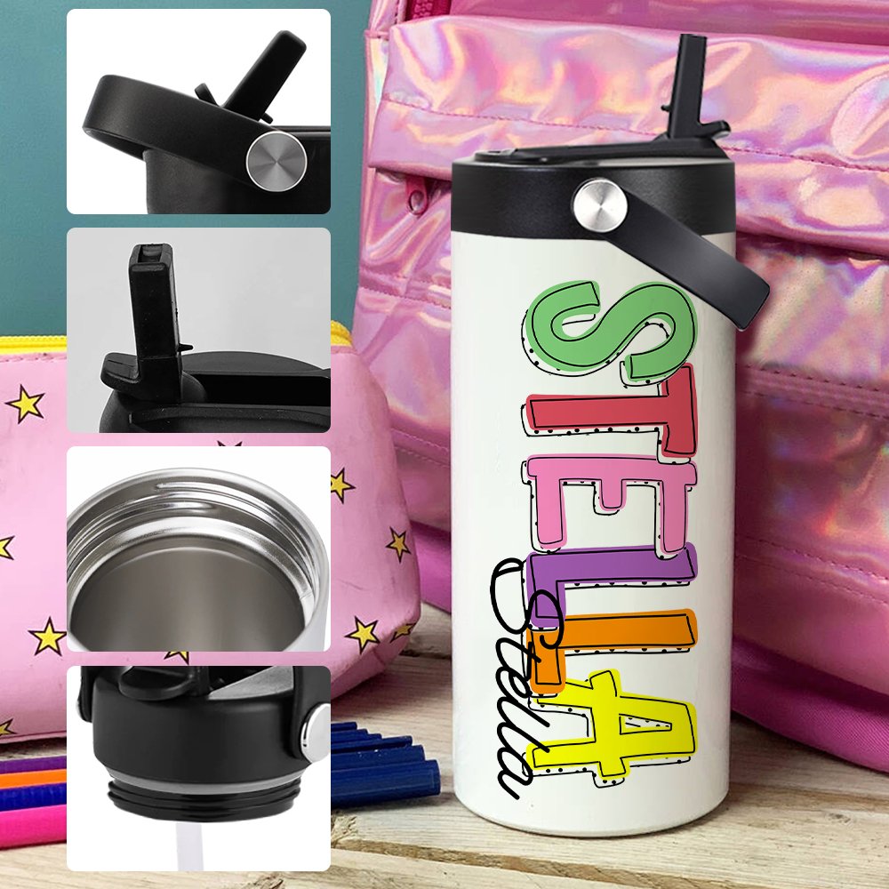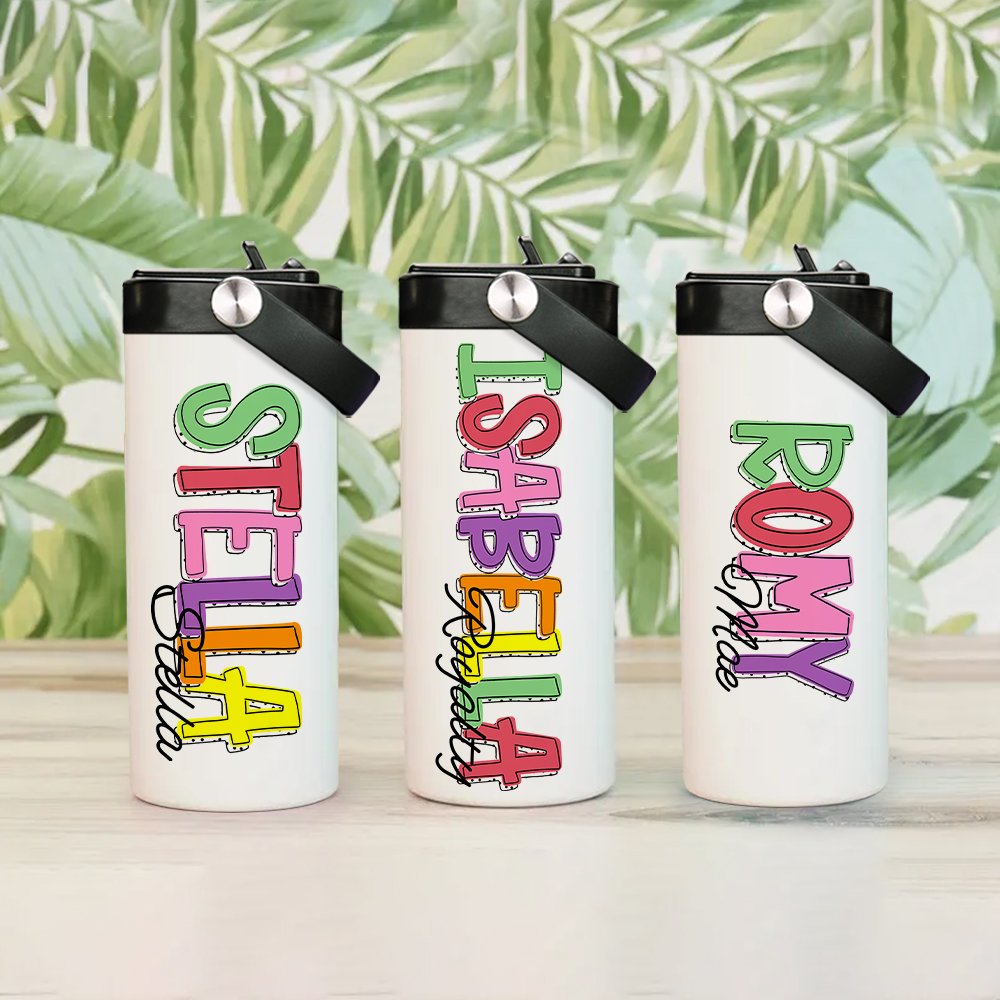 La parte anteriore di questo bicchiere d'acqua utilizza un design di lettere colorate con effetto 3D per visualizzare il vostro nome, che è ricco e interessante. È possibile aggiungere il proprio cognome per rendere il bicchiere più personale e creare un accessorio unico.