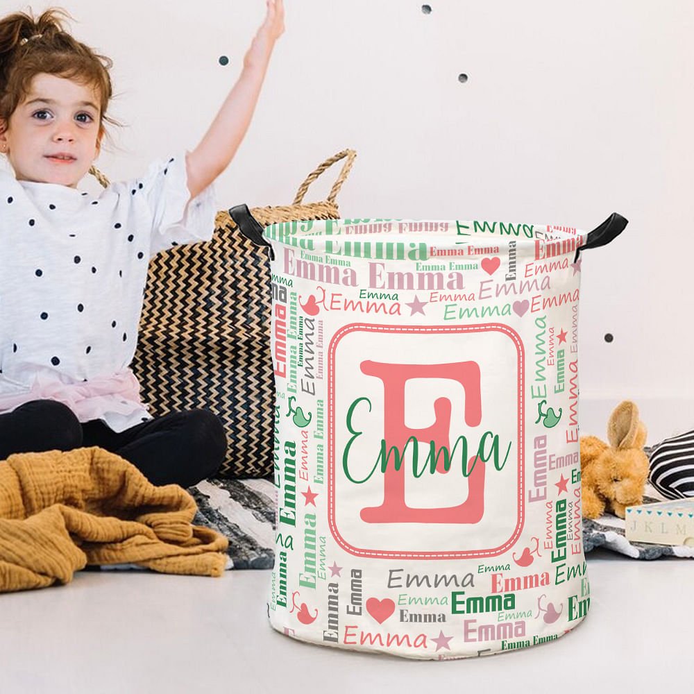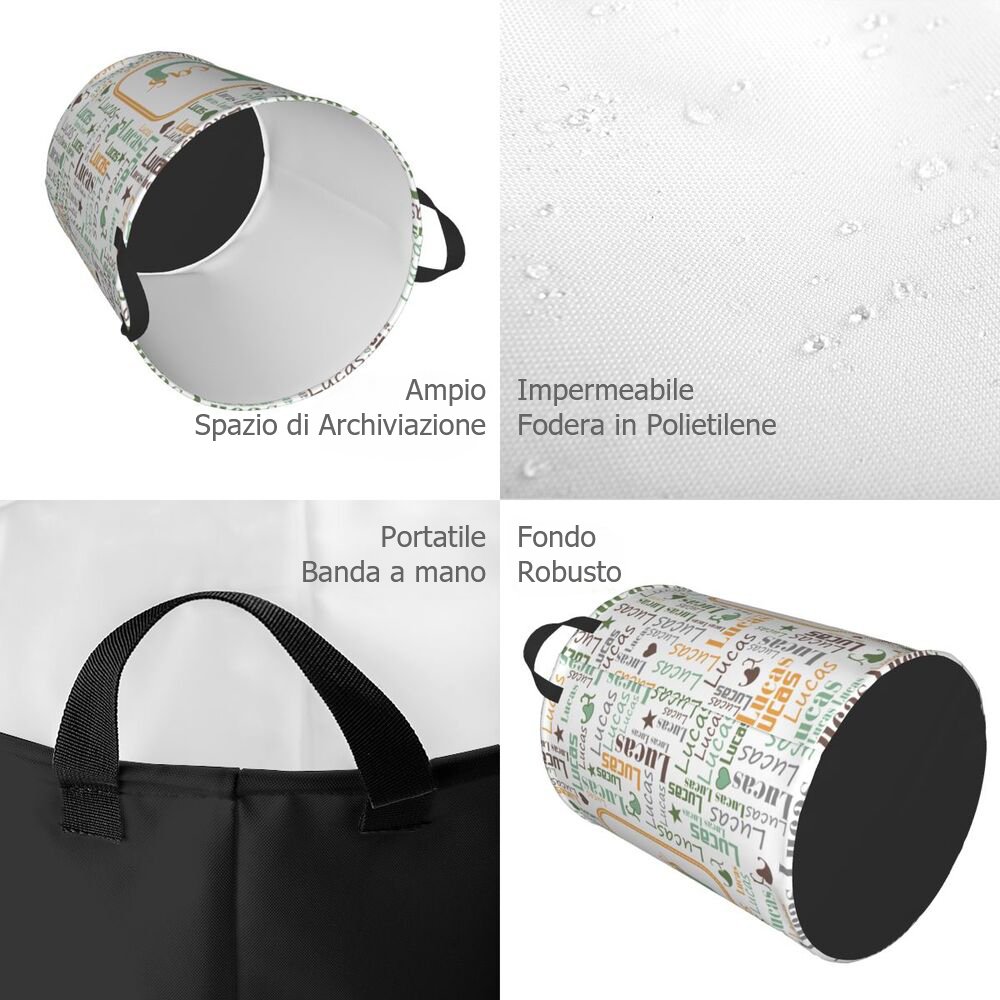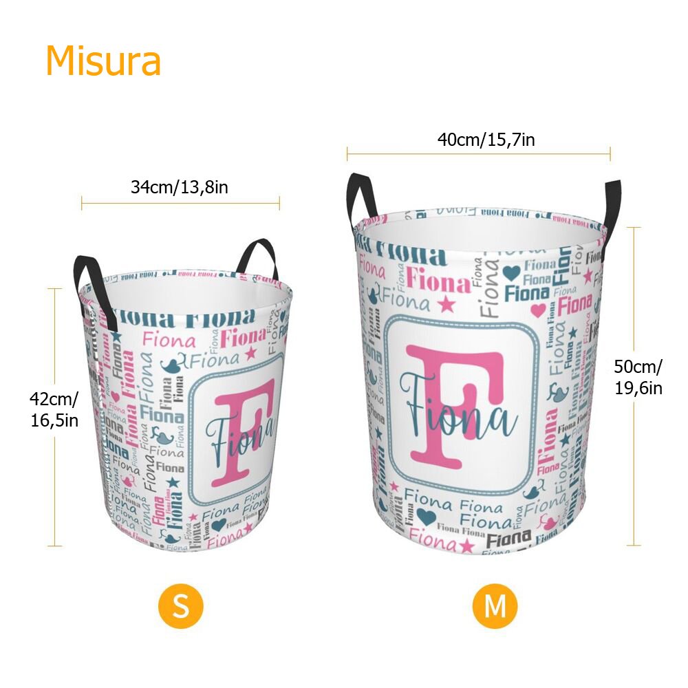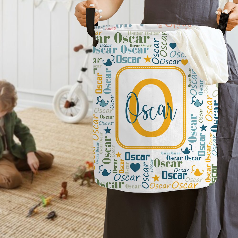Questo cesto portabiancheria presenta un design giocoso e colorato a nuvola di parole che mette in mostra il nome e l'iniziale del bambino in modo creativo. I colori vivaci e i motivi divertenti lo rendono un'aggiunta accattivante a qualsiasi stanza. La personalizzazione aggiunge un tocco speciale, trasformando una semplice soluzione di archiviazione in un caro ricordo.