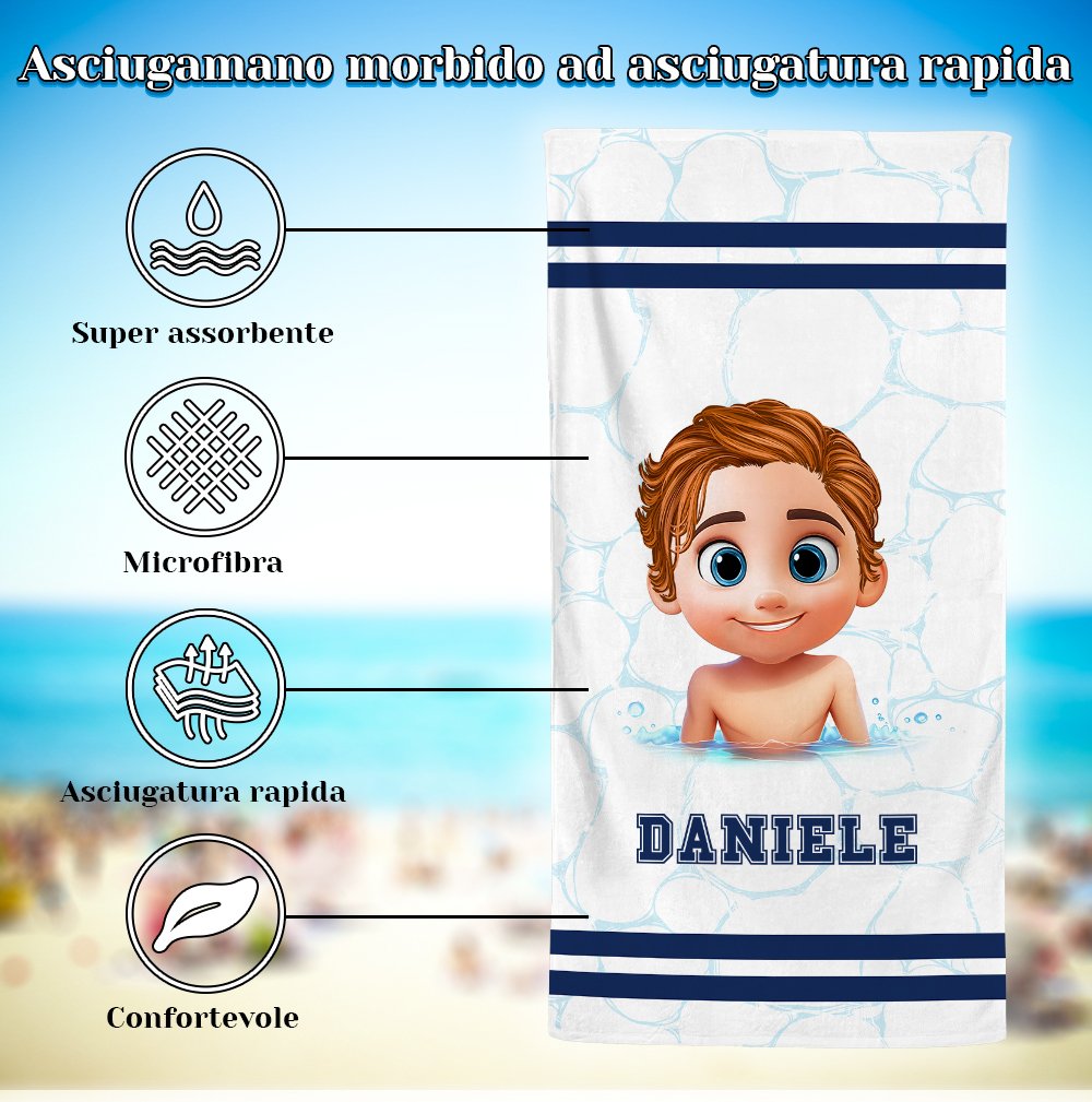 Il design 3D in stile cartone animato è ricco di allegria e vivacità, perfetto per rispecchiare l’innocenza dei bambini e risvegliare il bambino interiore anche negli adulti. Puoi personalizzare liberamente l’immagine del bambino che nuota e aggiungere un nome, creando un accessorio da spiaggia unico e imperdibile per i più piccoli.