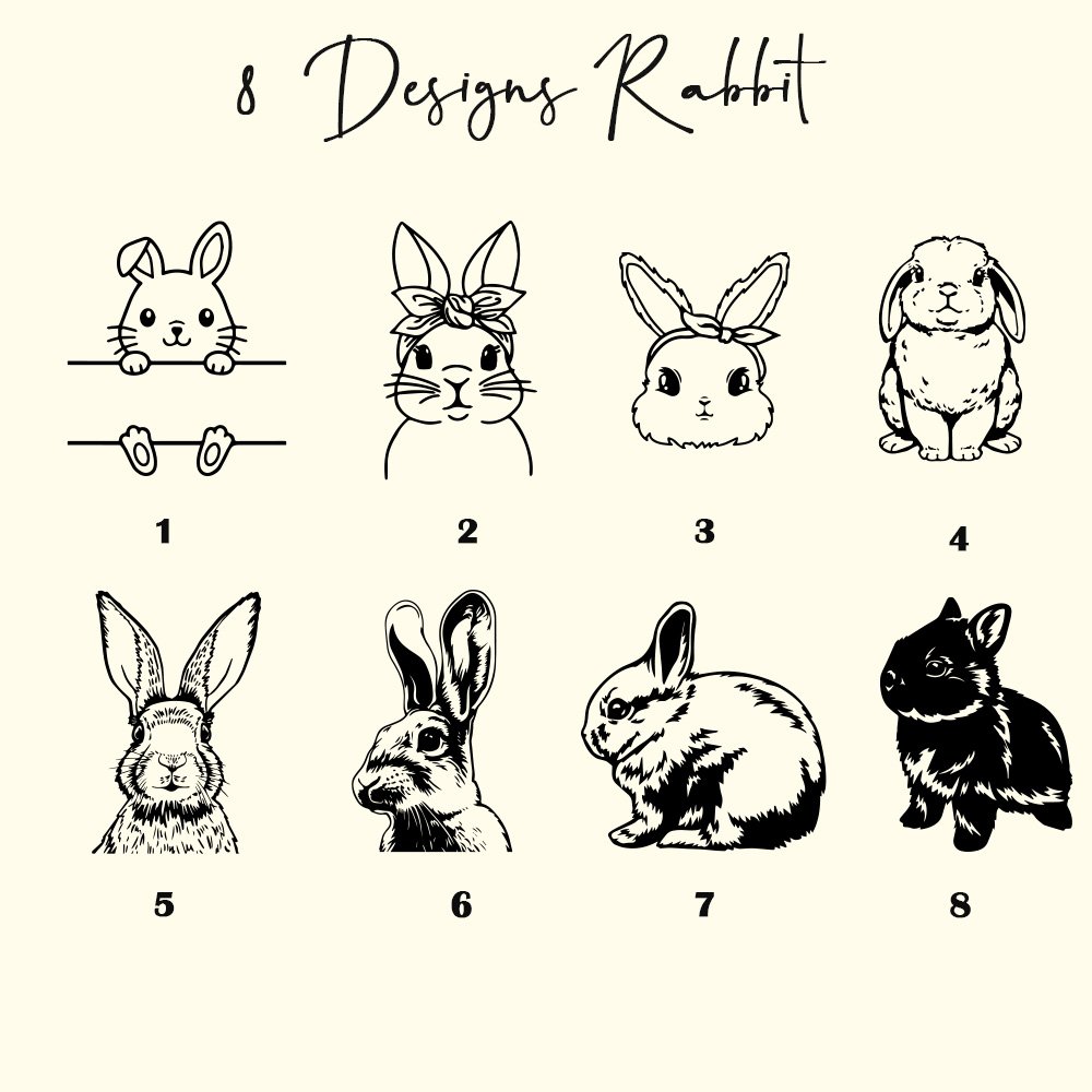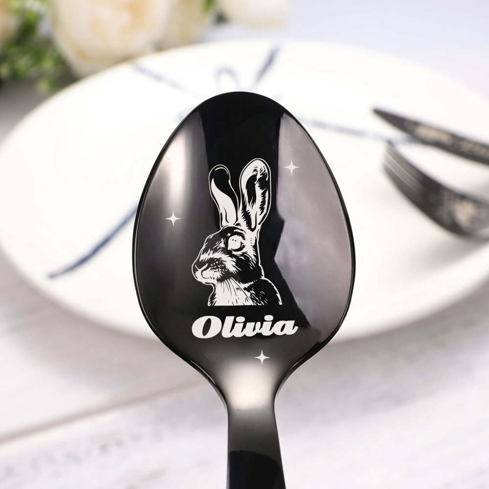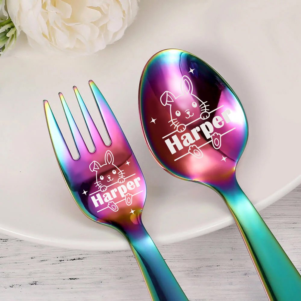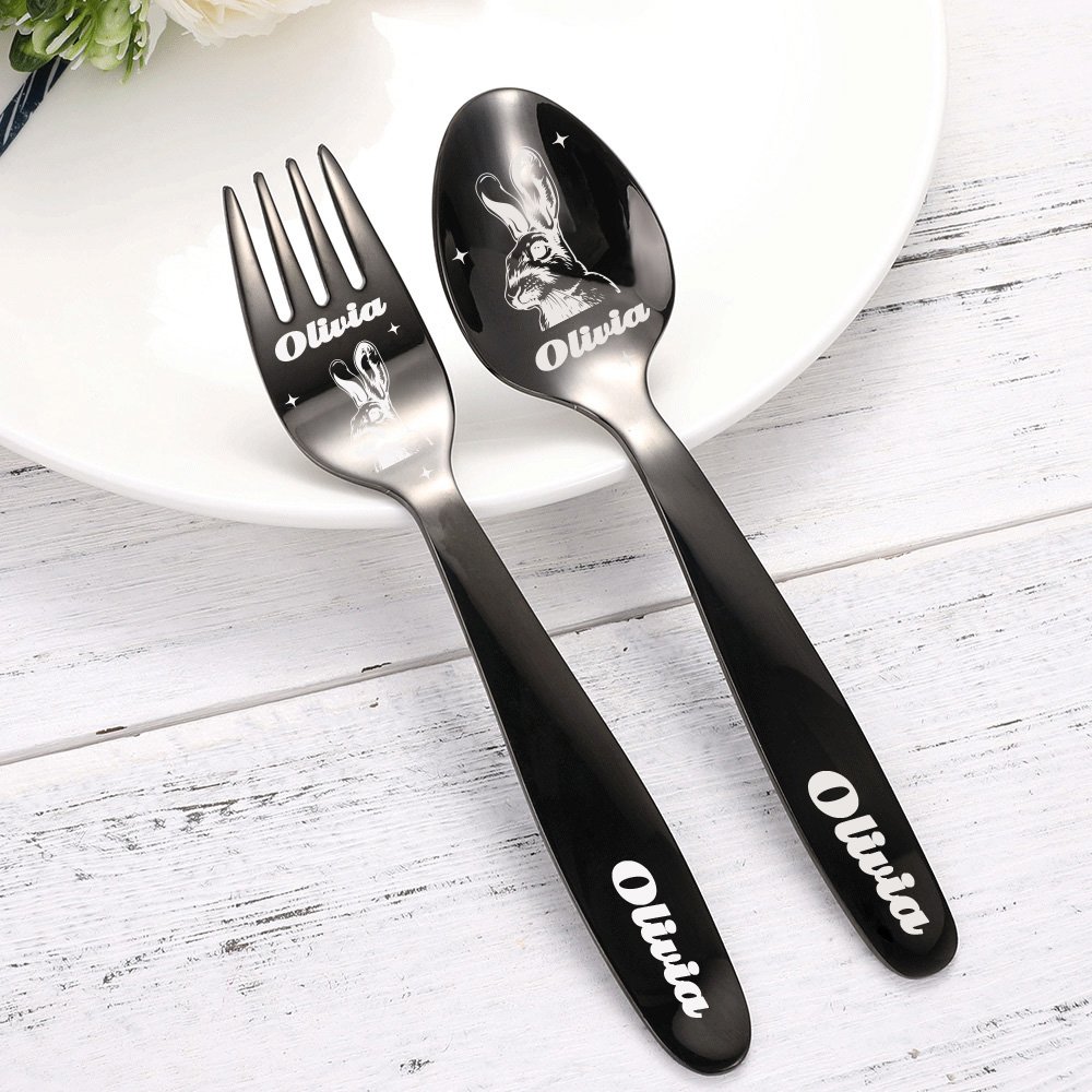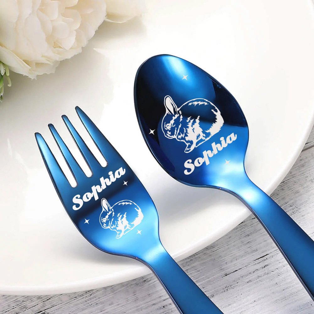 Le stoviglie possono essere personalizzate con qualsiasi nome o parola con un limite di 10 caratteri. Inoltre, è possibile scegliere il motivo del coniglietto preferito e il colore delle posate.