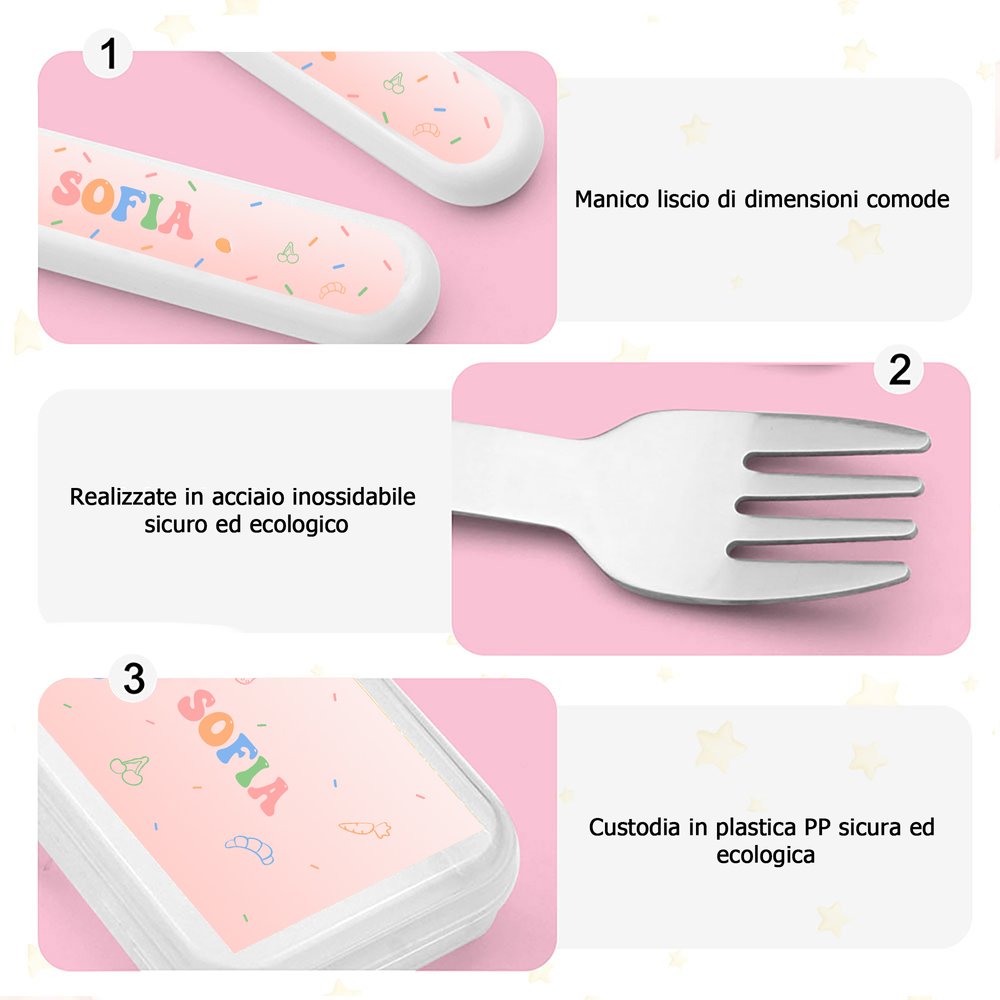 Questo set di posate ha un design in stile cartone animato con adorabili animali. Puoi scegliere tra 22 modelli carini in 6 colori vivaci, per soddisfare i gusti estetici dei bambini. Puoi anche personalizzare il nome con colori vivaci, combinando il nome del tuo bambino con gli animali in modo unico e speciale, rendendo i pasti più attesi e divertenti.