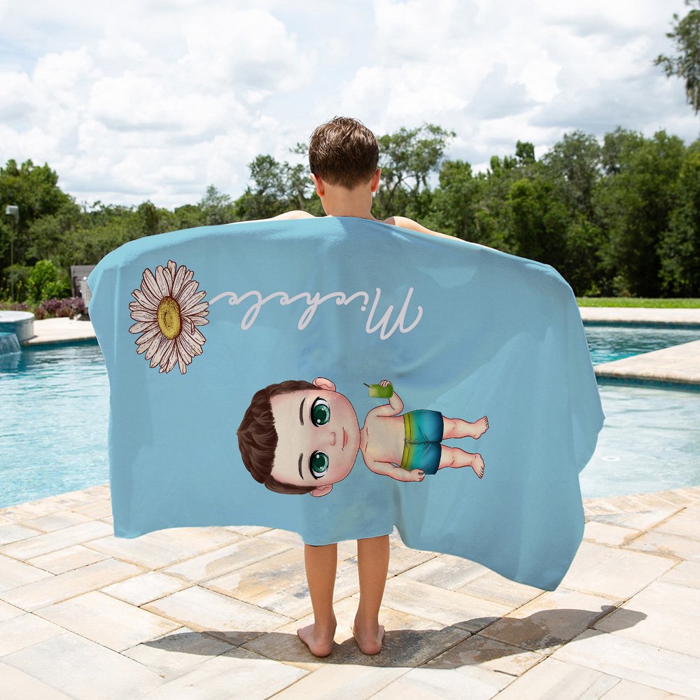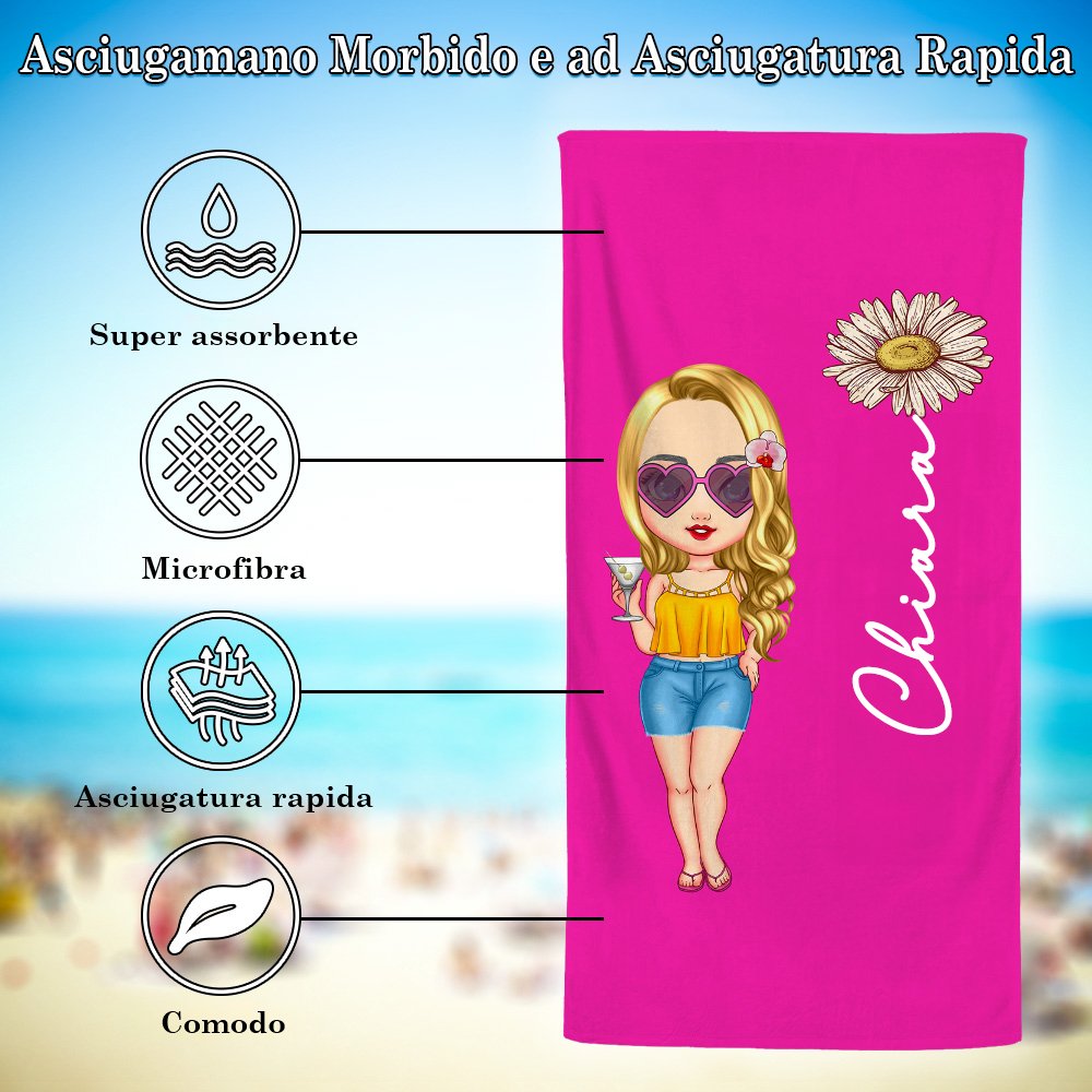 Il design di questo asciugamano da spiaggia è vivace e accattivante. Unisce costumi estivi tipici da vacanza al mare con fiori di compleanno. Puoi creare personaggi dei cartoni animati divertenti e carini in base alla tua immagine, esprimendo così la tua personalità. Inoltre, puoi personalizzare il tuo nome sull'asciugamano, con il fiore di compleanno abbinato al nome per renderlo ancora più unico. La combinazione di colori vivaci e motivi giocosi aggiunge un tocco divertente e alla moda al tuo viaggio in spiaggia.