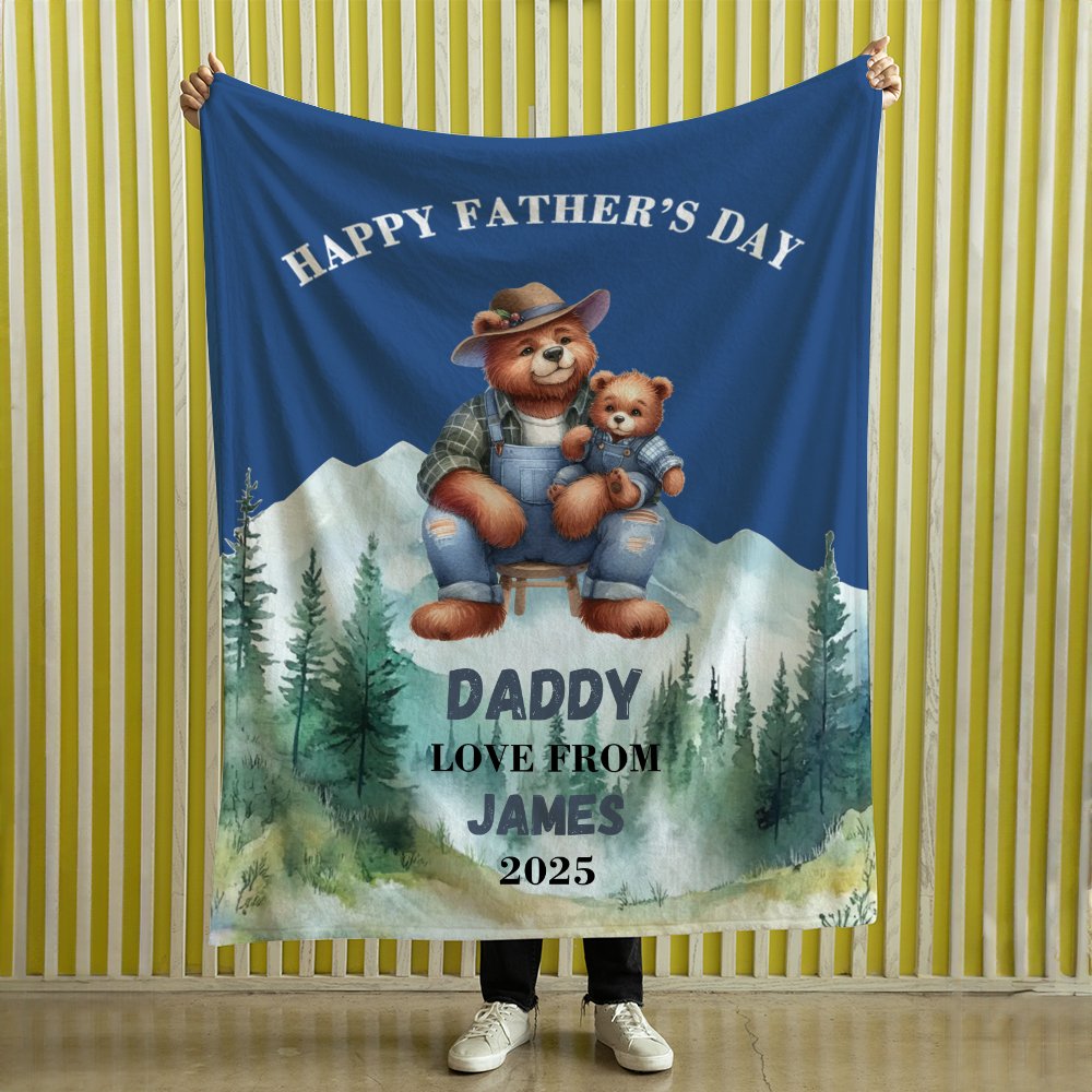 Questa coperta è caratterizzata da una calda illustrazione di un orso dei cartoni animati, che raffigura un papà orso e il suo piccolo orso seduti in una scena di montagna. Il disegno complessivo è carino e pieno di calore, e trasmette un forte senso di famiglia. Il biglietto è stampato con un titolo fisso o personalizzato "HAPPY FATHER'S DAY", e si possono personalizzare il proprio nome e quello del bambino e l'anno, rendendolo un ricordo unico.