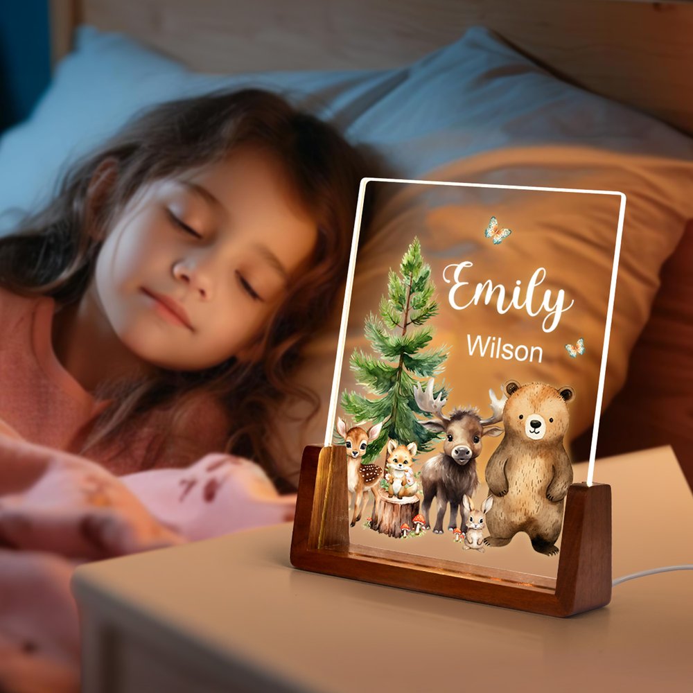 Caratterizzata da animali della giungla come volpi, conigli, cervi e orsi come elementi centrali del design, con accenti di alberi e farfalle, questo pezzo è reso in uno stile da cartone animato pieno di fascino e immaginazione infantile. La personalizzazione con nome e cognome trasforma la luce notturna da un normale oggetto decorativo in un ricordo unico e personale.