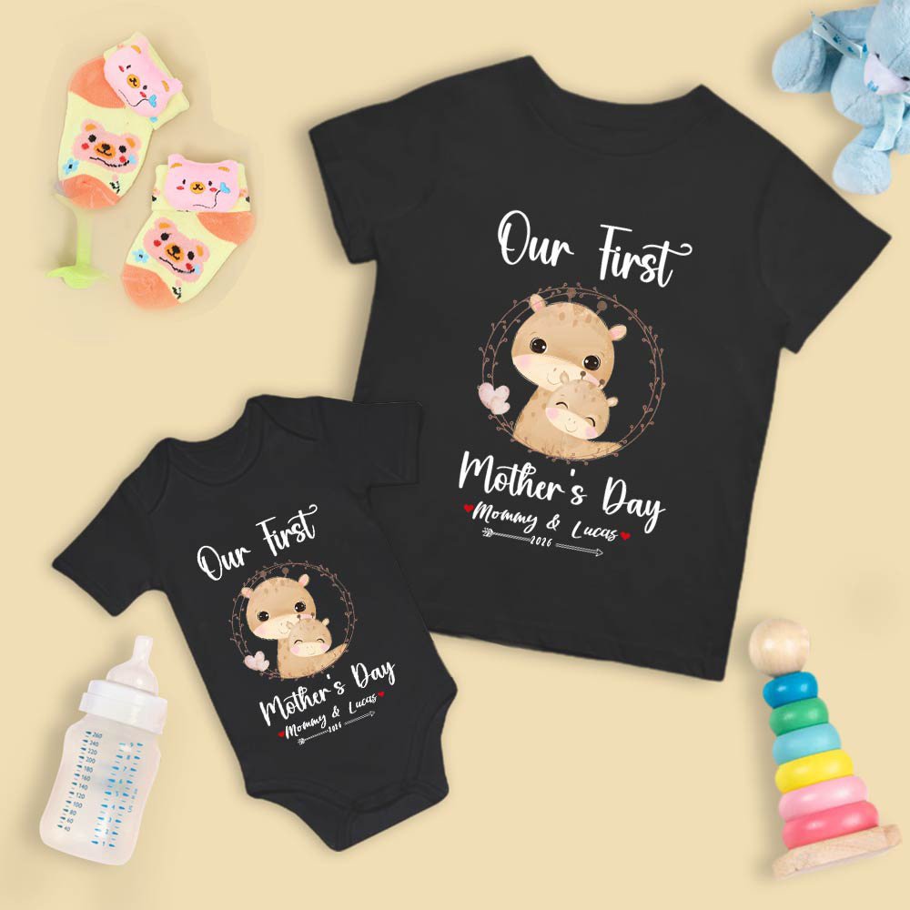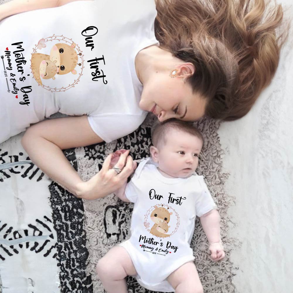 I nostri capi sono disegnati con un simpatico cervo genitore-figlio come elemento di design; il cerbiatto è accoccolato tra le braccia della madre, caldo e accogliente, per esprimere l'amore tra madre e figlio. La citazione in evidenza "La nostra prima festa della mamma" rende l'atmosfera di festa più forte e calda.