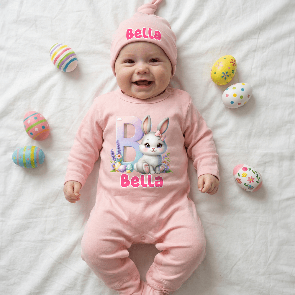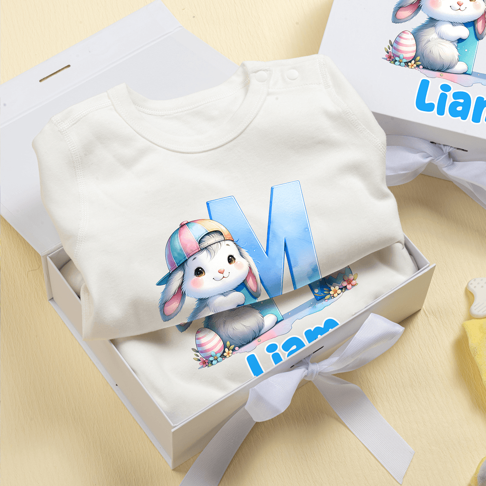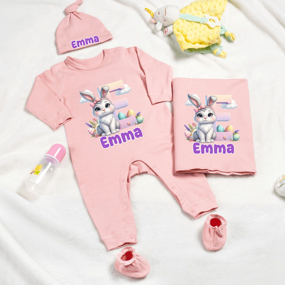 Questo set regalo a tema pasquale, composto da quattro pezzi appositamente studiati per i neonati e i bambini, comprende una tutina, un cappellino, una coperta e una splendida scatola. Caratterizzato dall'adorabile coniglietto pasquale come elemento centrale, può essere personalizzato con il nome e le iniziali del bambino, aggiungendo un tocco di allegria e personalizzazione.
