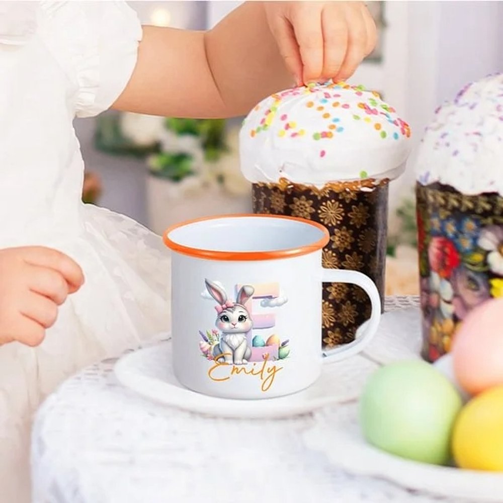 Questa adorabile tazza smaltata raffigura un simpatico coniglietto pasquale, aggiungendo un tocco festoso e allegro alle vostre celebrazioni. Personalizzatela con il nome e l’iniziale del vostro bambino per renderla ancora più speciale, creando un regalo unico che il vostro piccolo apprezzerà ogni Pasqua.