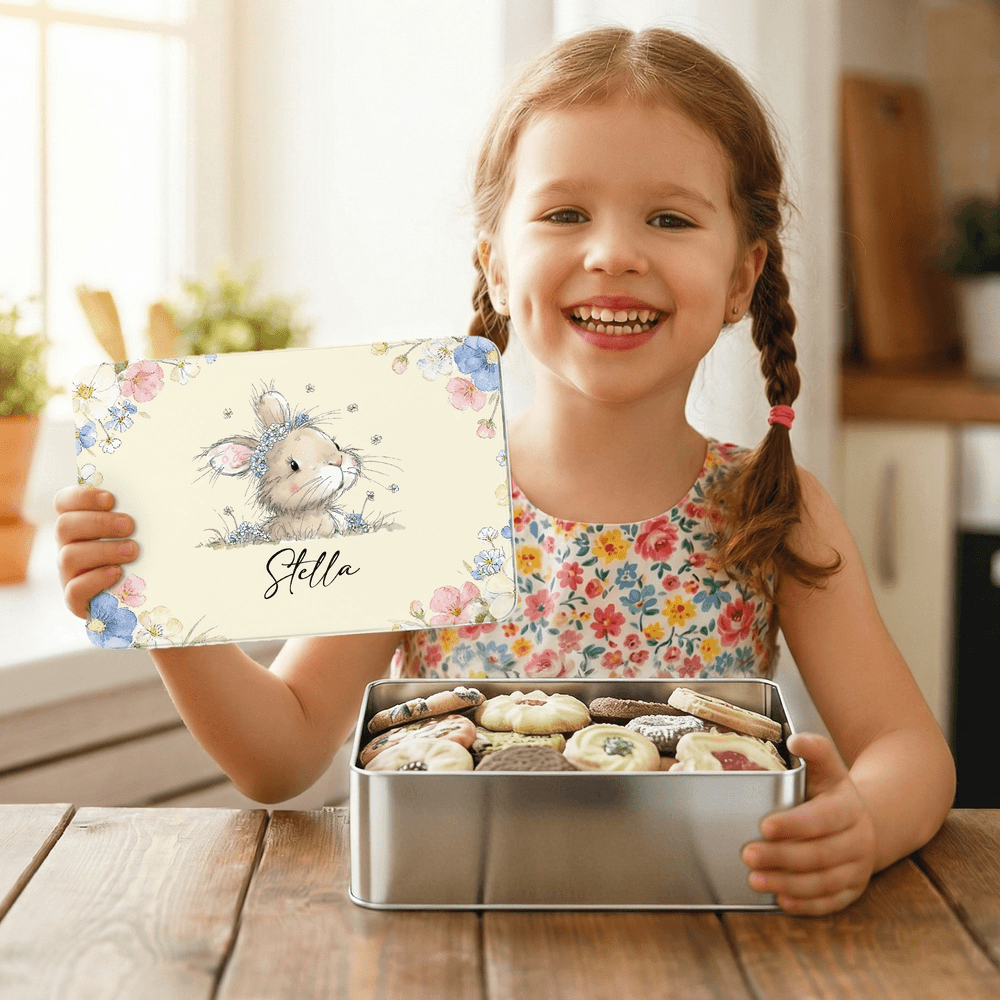 La nostra scatola di biscotti presenta un design a tema pasquale, che combina motivi di ghirlande e coniglietti per creare una forte atmosfera di festa. Il corpo della latta può essere personalizzato con un nome, conferendo alla scatola dei biscotti un emblema unico e lasciando che ogni snack porti con sé un'impronta personale. La palette di colori tenui crea un'esperienza d'uso calda e invitante.