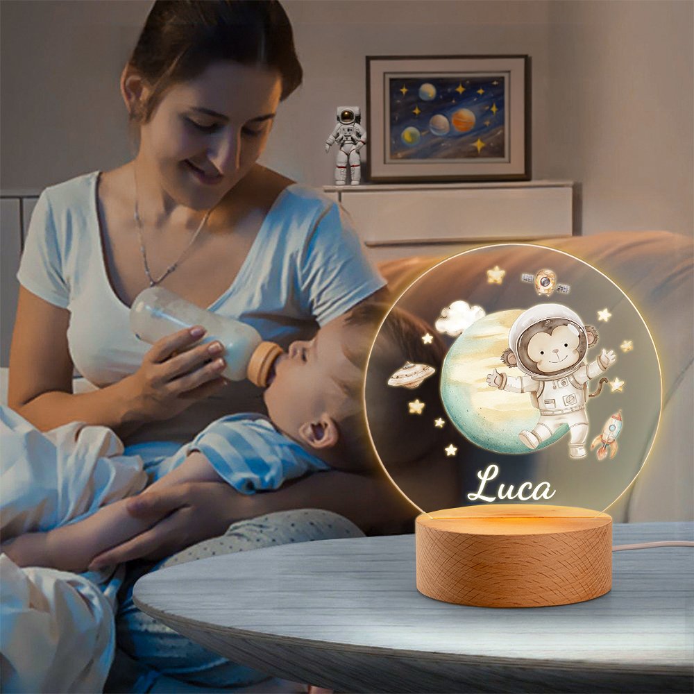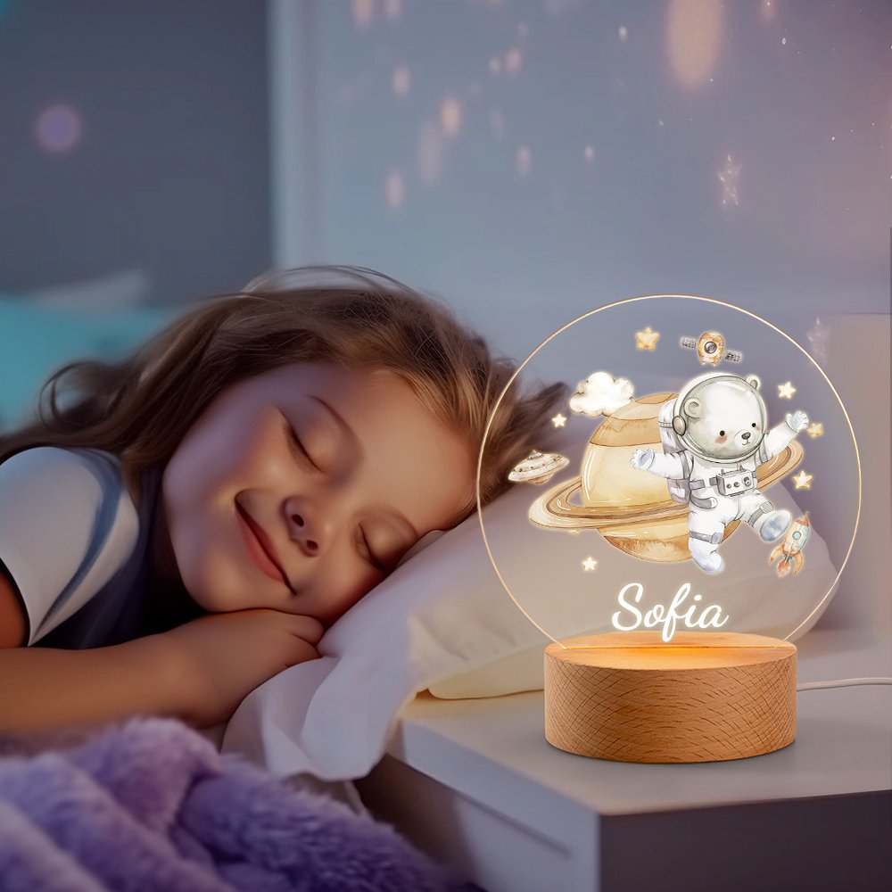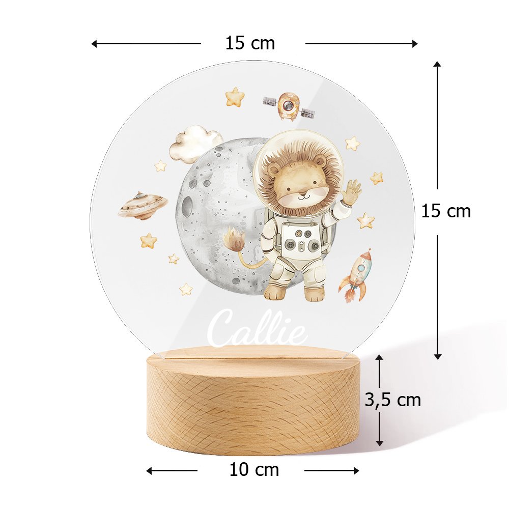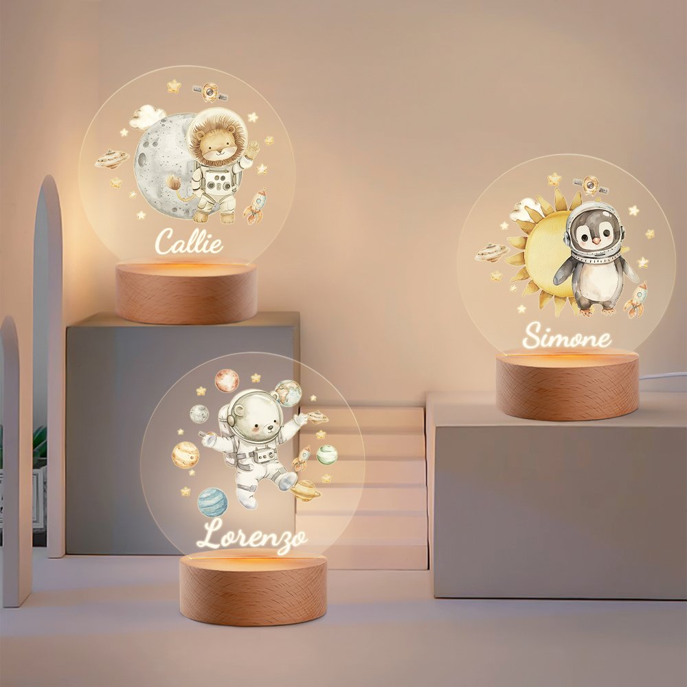 Progettata con simpatici astronauti, leoni e pinguini, oltre a affascinanti pianeti del sistema solare, questa luce notturna non solo decora la stanza del bambino, ma stimola anche la sua curiosità per l'universo e l'esplorazione dello spazio. L’aggiunta del nome del bambino rende il design ancora più unico e personale.