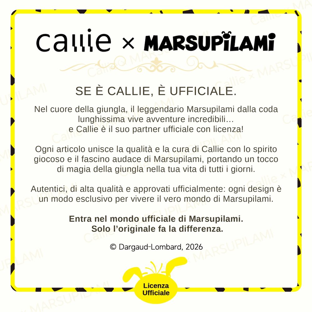 Callie è onorata di offrire prodotti con licenza ufficiale Marsupilami® in collaborazione con il detentore dei diritti di questo iconico cartone animato belga. Realizziamo prodotti di alta qualità che catturano autenticamente il fascino senza tempo di Marsupilami. Garantisce il 100% di autenticità, consentendovi di portare a casa questo classico tesoro dei cartoni animati di gioia e nostalgia in tutta tranquillità.