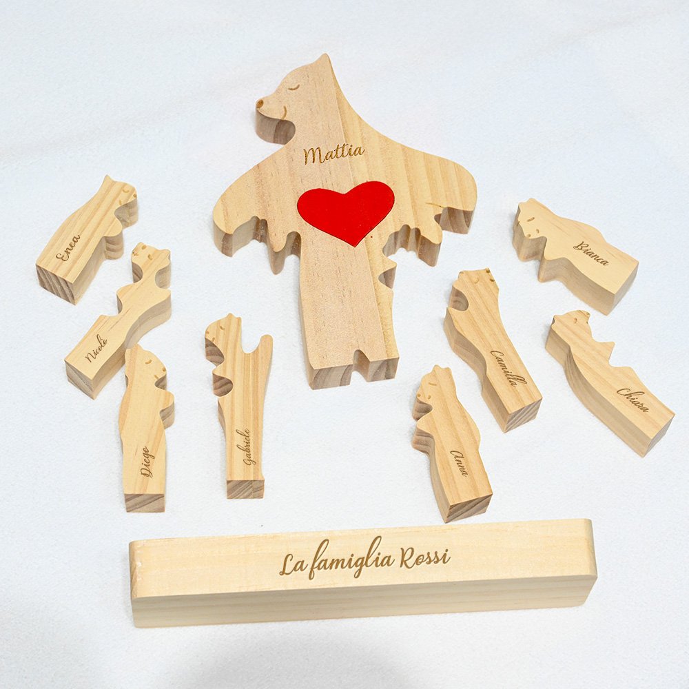 Questo puzzle in legno raffigura dei teneri orsetti polari in stile cartone animato che si abbracciano, con un cuore rosso al centro, simbolo del calore e della vicinanza familiare. Può essere personalizzato con da 2 a 9 orsetti e i nomi di ogni membro della famiglia, aggiungendo un tocco unico al tuo spazio.