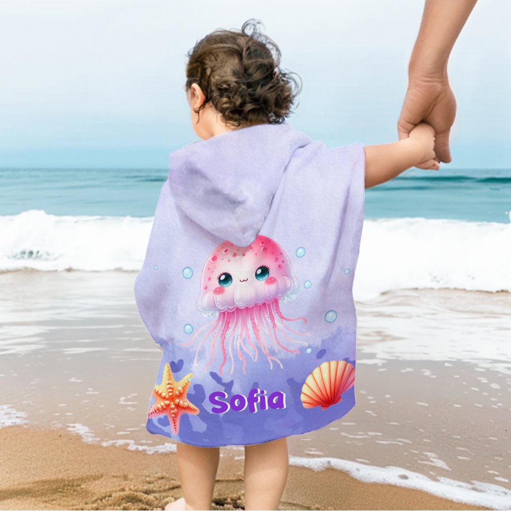 Il tuo telo da mare con cappuccio presenta 16 simpatiche creature marine, tra cui pesci pagliaccio, polpi, tartarughe, meduse e granchi. Conchiglie, stelle marine e bolle d'acqua arricchiscono il motivo giocoso, dando vita all'oceano e stimolando la fantasia durante le giornate in spiaggia o in piscina. Puoi personalizzarlo con il nome di tuo figlio per un tocco unico e indimenticabile.