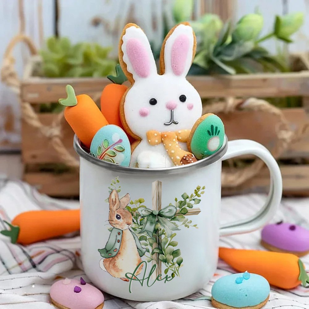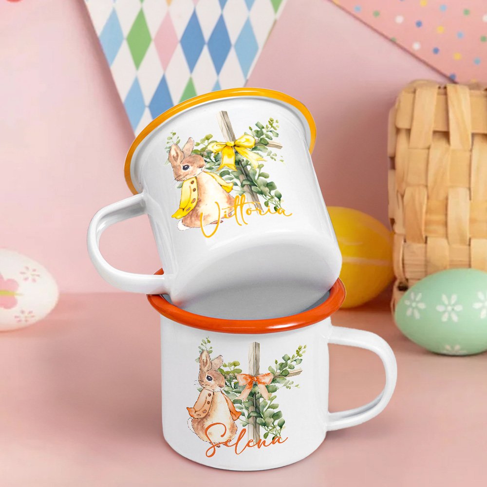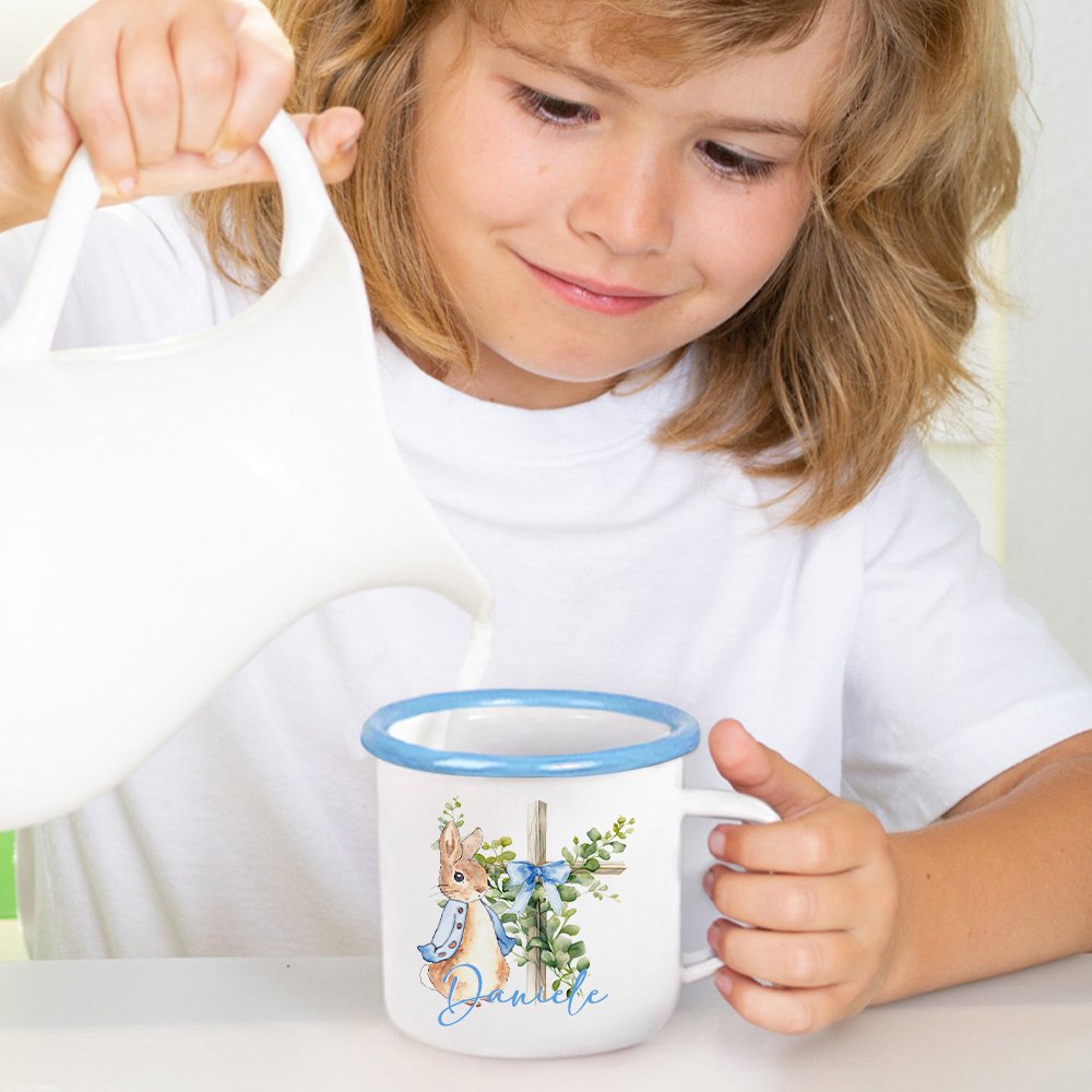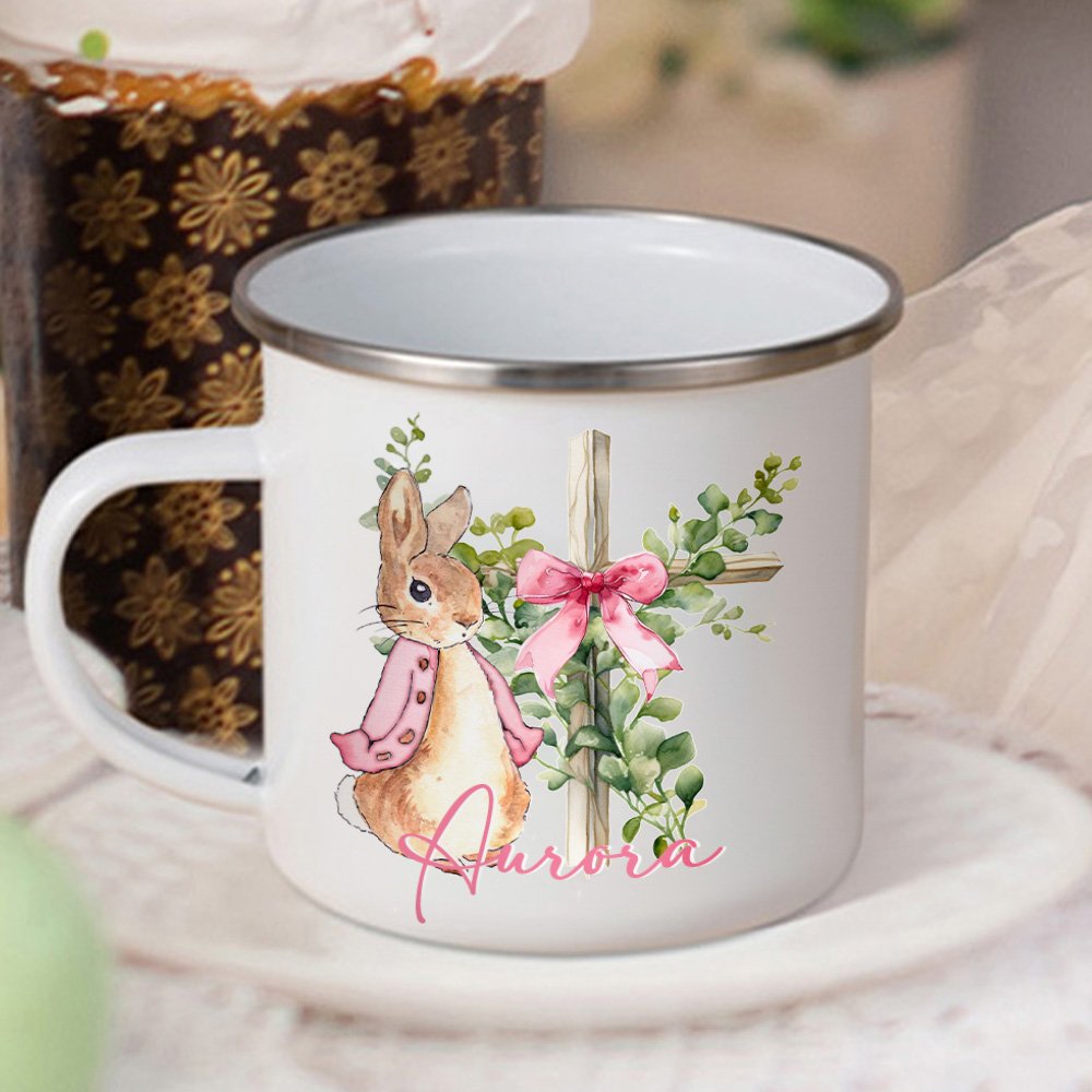 Unendo il design del fiocco, della croce e della foglia verde, questa tazza smaltata porta un tocco di calore alla vita quotidiana. La parte anteriore della tazza presenta l'immagine vivace e simpatica di Peter Rabbit, accompagnata da accessori coordinati che creano un effetto visivo fresco e naturale. Grazie alla personalizzazione con il nome, questa tazza diventa un oggetto unico e significativo, perfetto sia per uso personale che come regalo.
