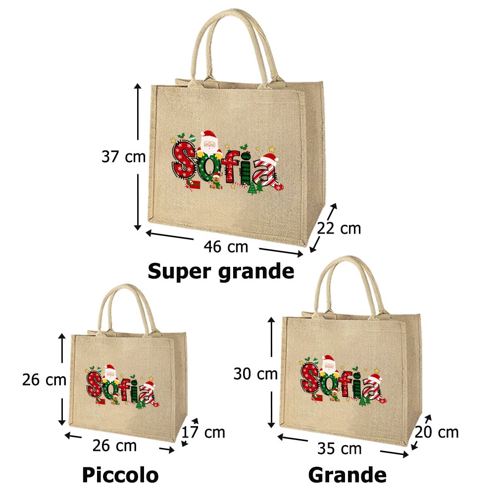Questa borsa tote presenta simpatici disegni di Babbo Natale, alberi di Natale e lettere a tema natalizio, catturando perfettamente la gioia delle feste. Puoi personalizzarla con un nome, rendendola un regalo unico e speciale per chi vuoi.