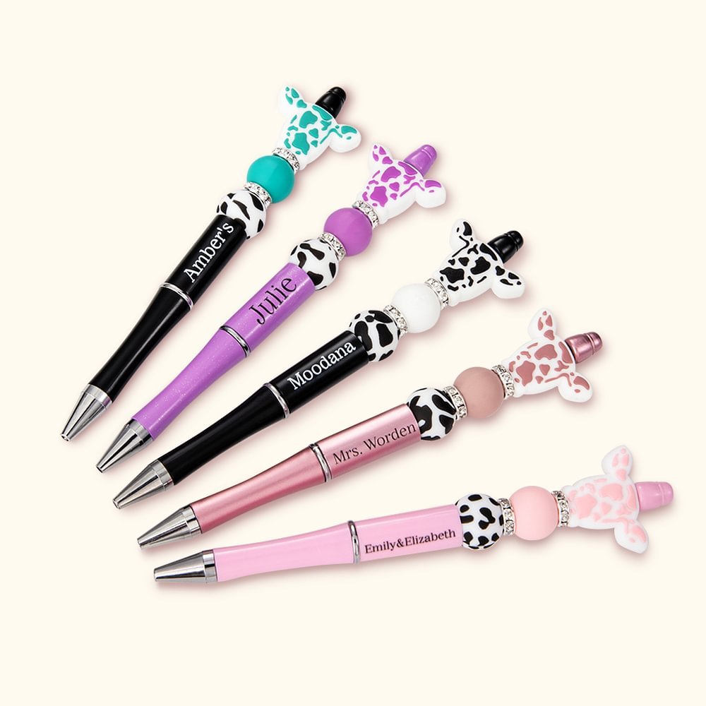 Distinguetevi dalle penne tradizionali con questa penna con perline personalizzata, caratterizzata da affascinanti perline a forma di testa di mucca e da un disegno western con stampa di mucca. Il fusto della penna può essere personalizzato con un testo, aggiungendo un tocco personale al vostro strumento di scrittura.