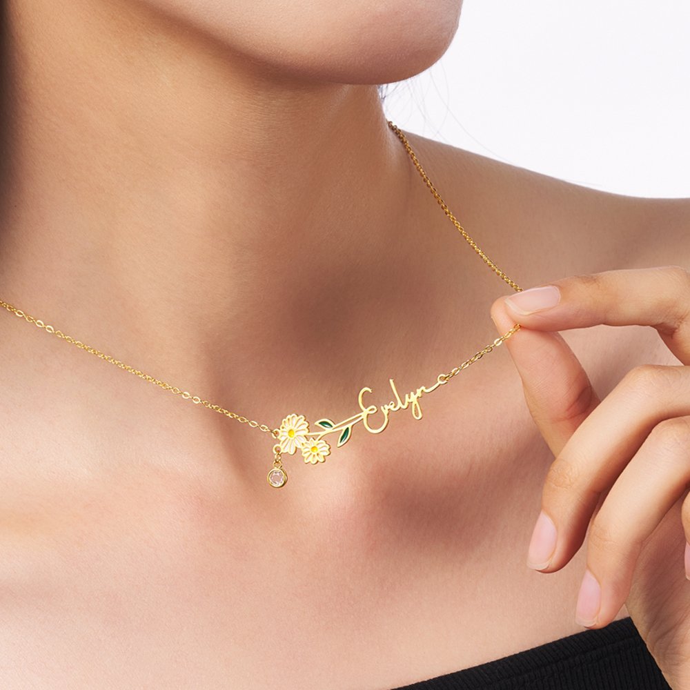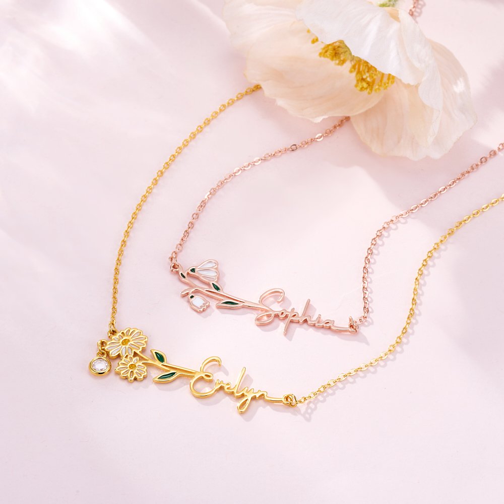 La collana presenta un fiore di nascita e una delicata pietra di nascita per rappresentare il mese di nascita, con un nome graziosamente incorporato nel design. La combinazione di fiori di nascita colorati, nomi e pietre natali crea un gioiello elegante, significativo e minimalista.